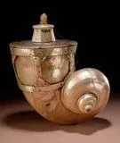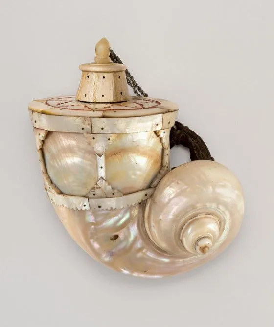 - Shell of a Green Sea Snail (turbo marmoratus) with mother-of-pearl, wood, and lac; copper, steel, and leather fittings