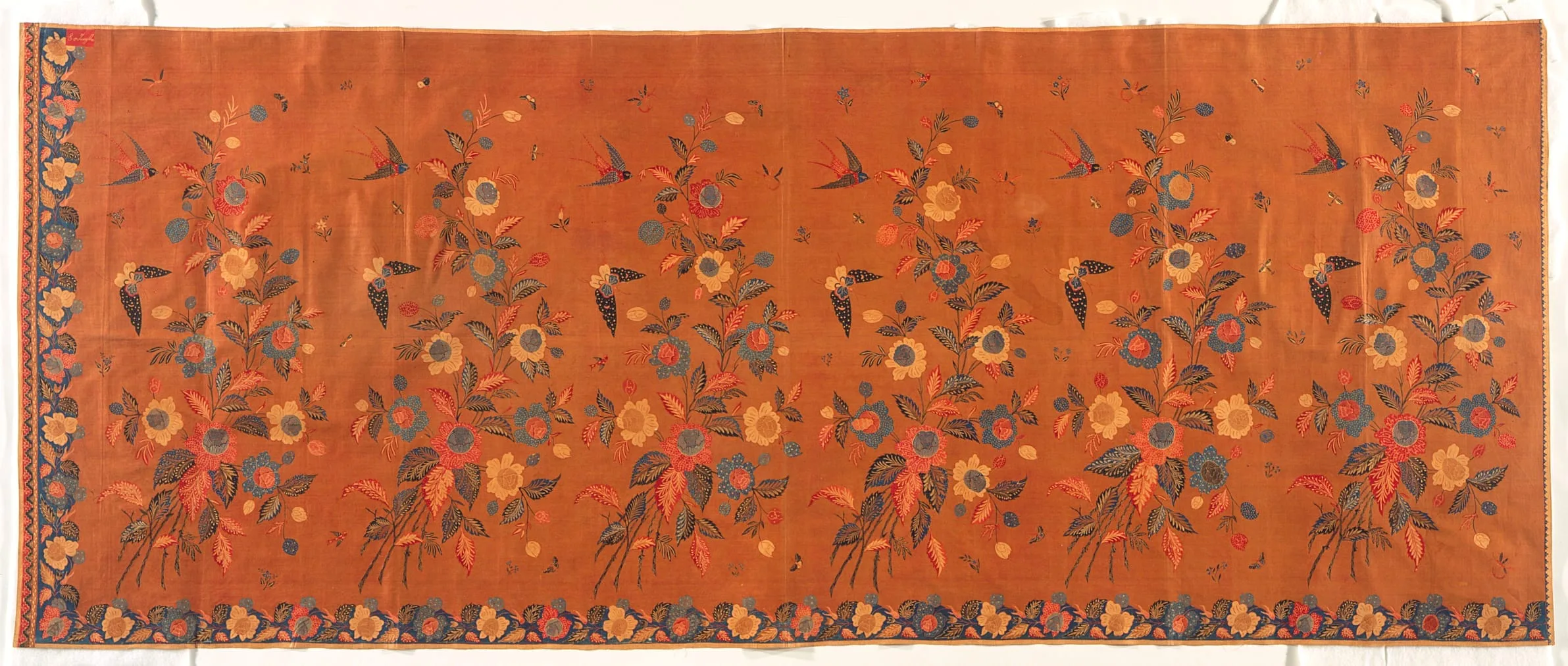 - Hand-drawn wax resist (batik) on machine-woven cotton, natural dyes, waxed signature