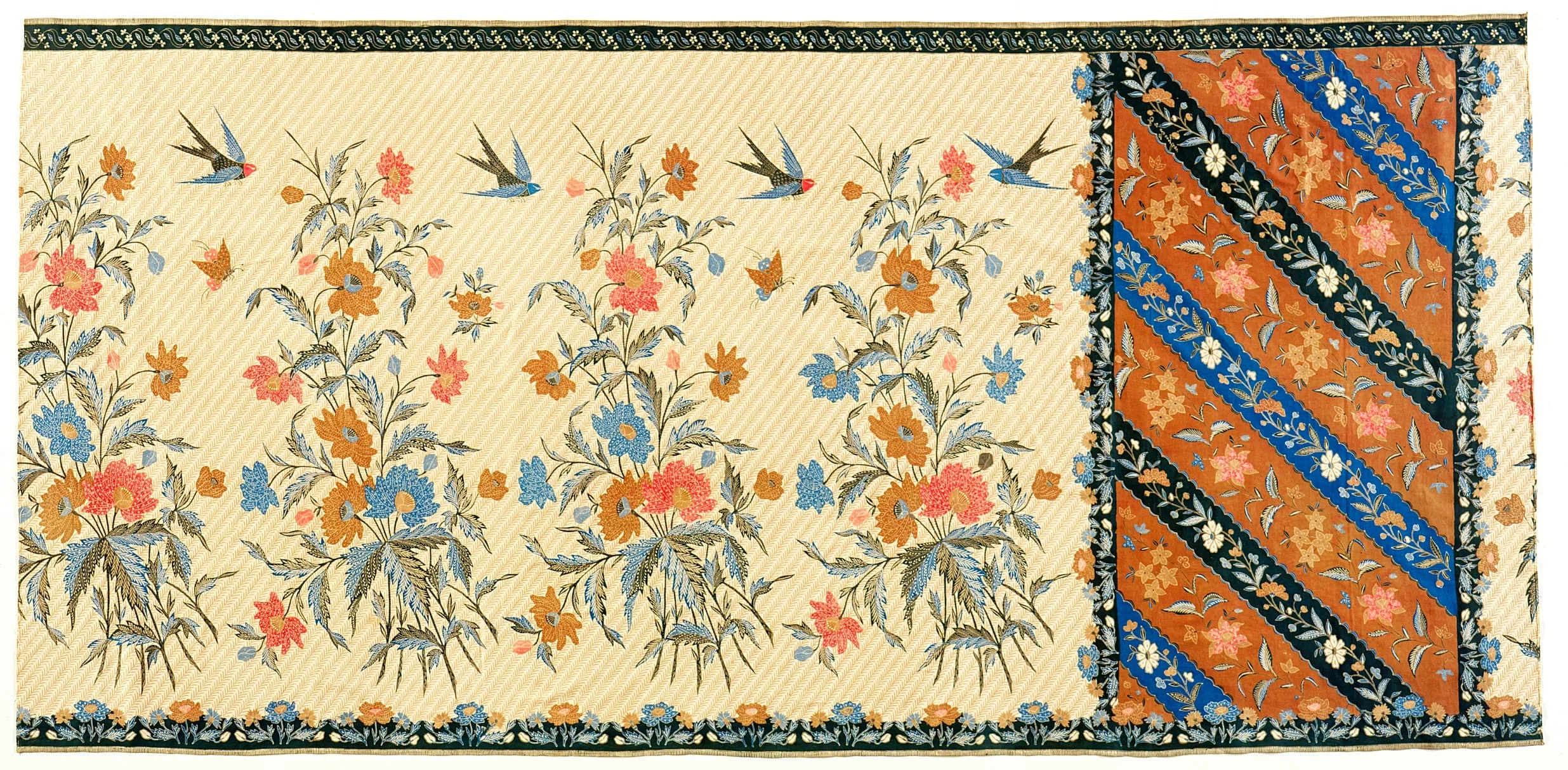 - Hand-drawn wax resist (batik) on machine-woven cotton, natural dyes, waxed and stamped signatures