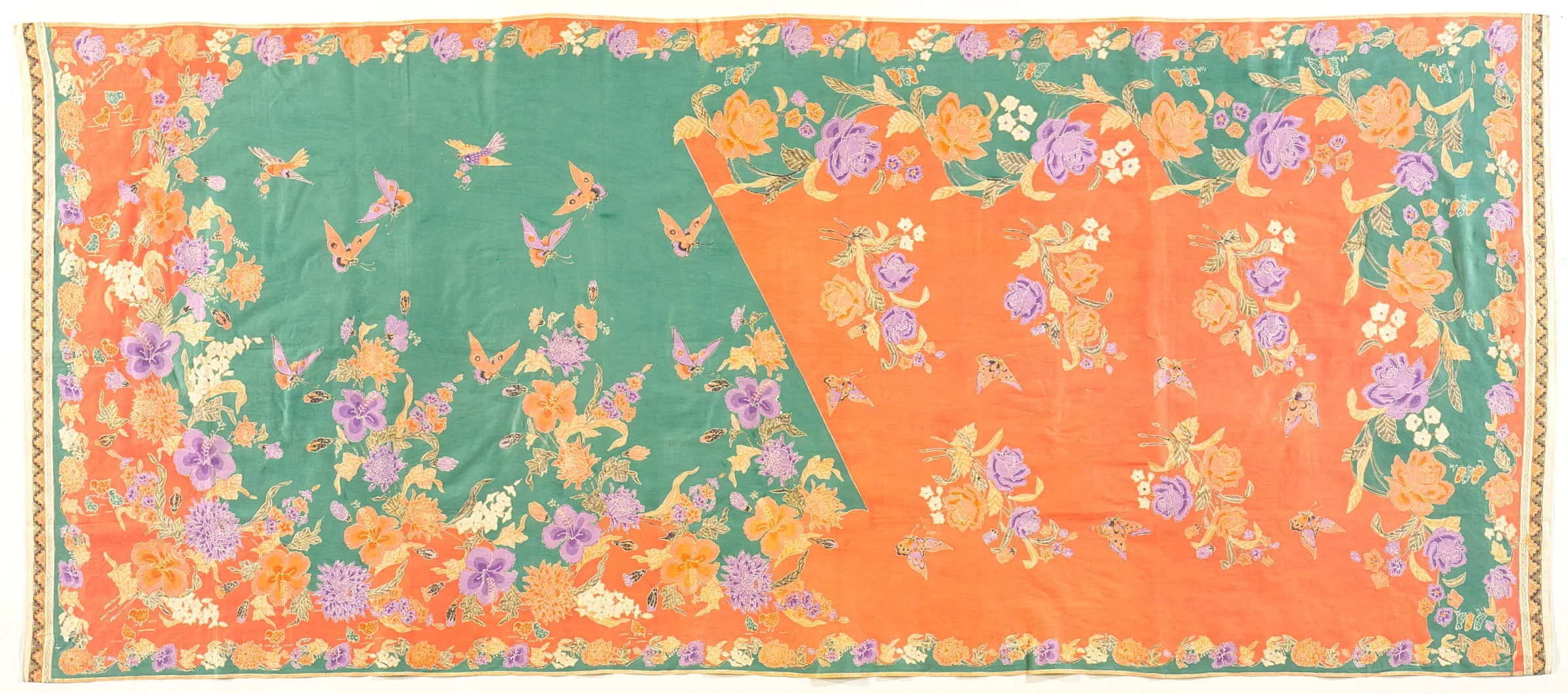 - Hand-drawn wax resist (batik) on machine-woven cotton, synthetic dyes, waxed signature