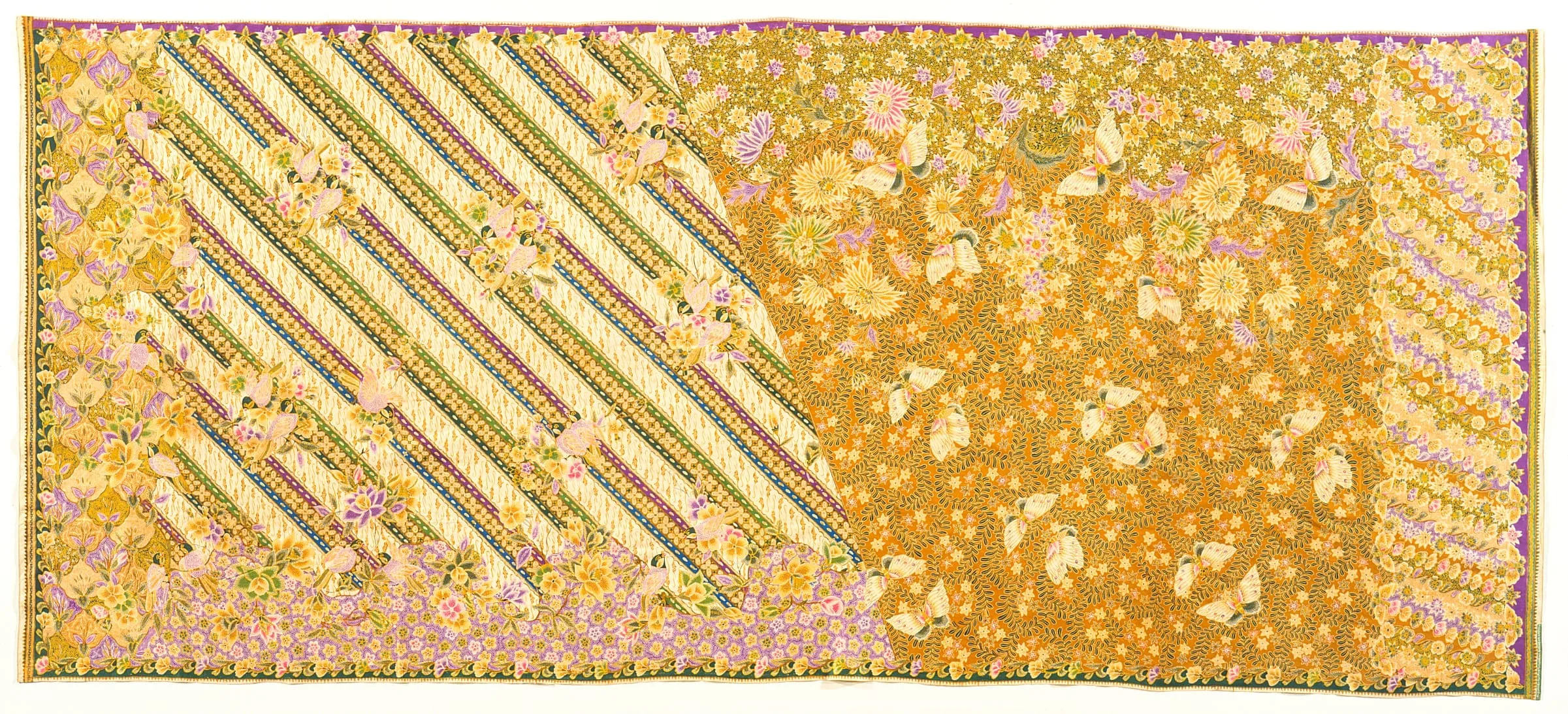 - Hand-drawn wax resist (batik) on machine-woven cotton, synthetic dyes, waxed signature