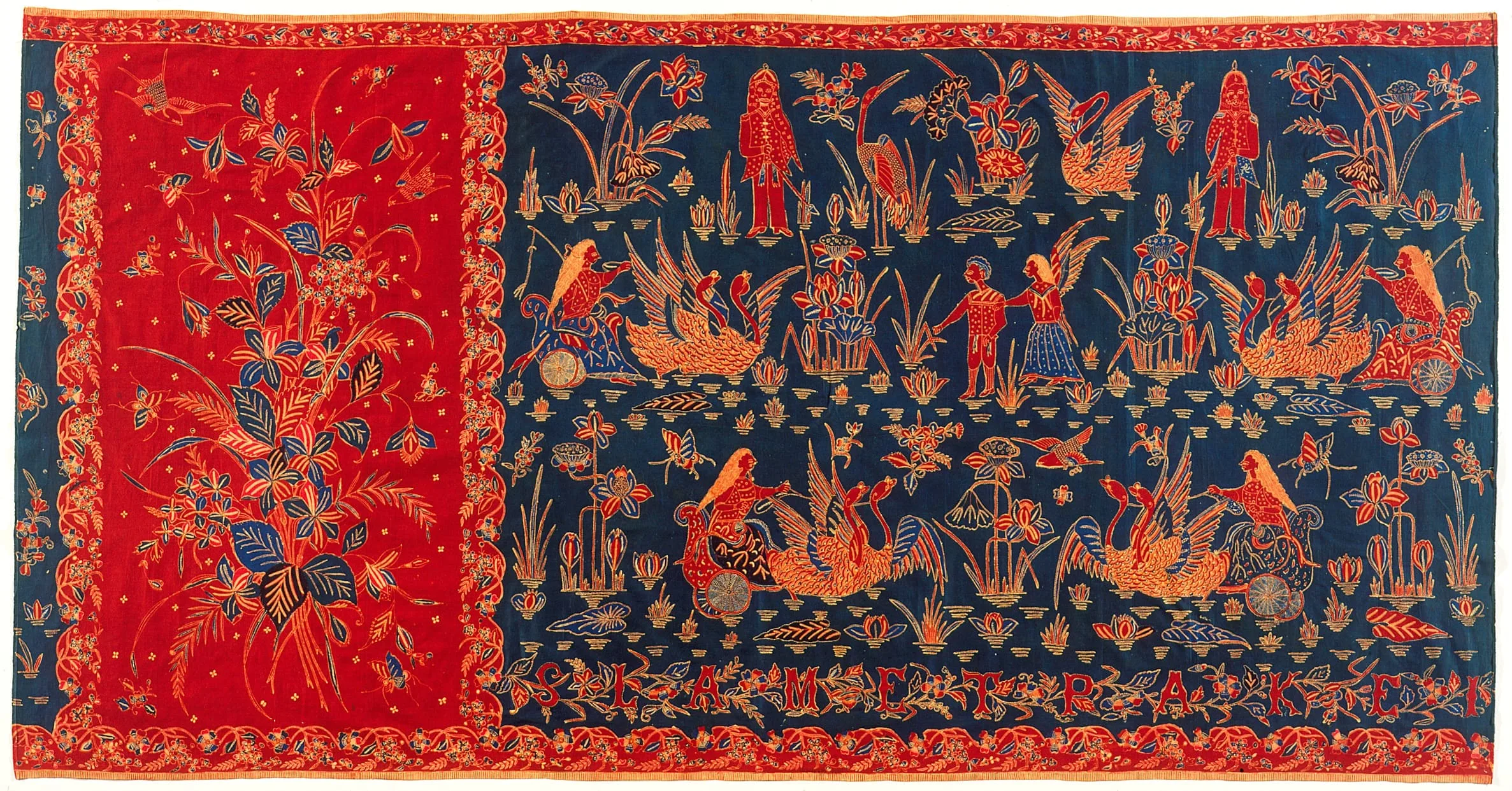 - Hand-drawn wax resist (batik) on machine-woven cotton, natural and synthetic dyes