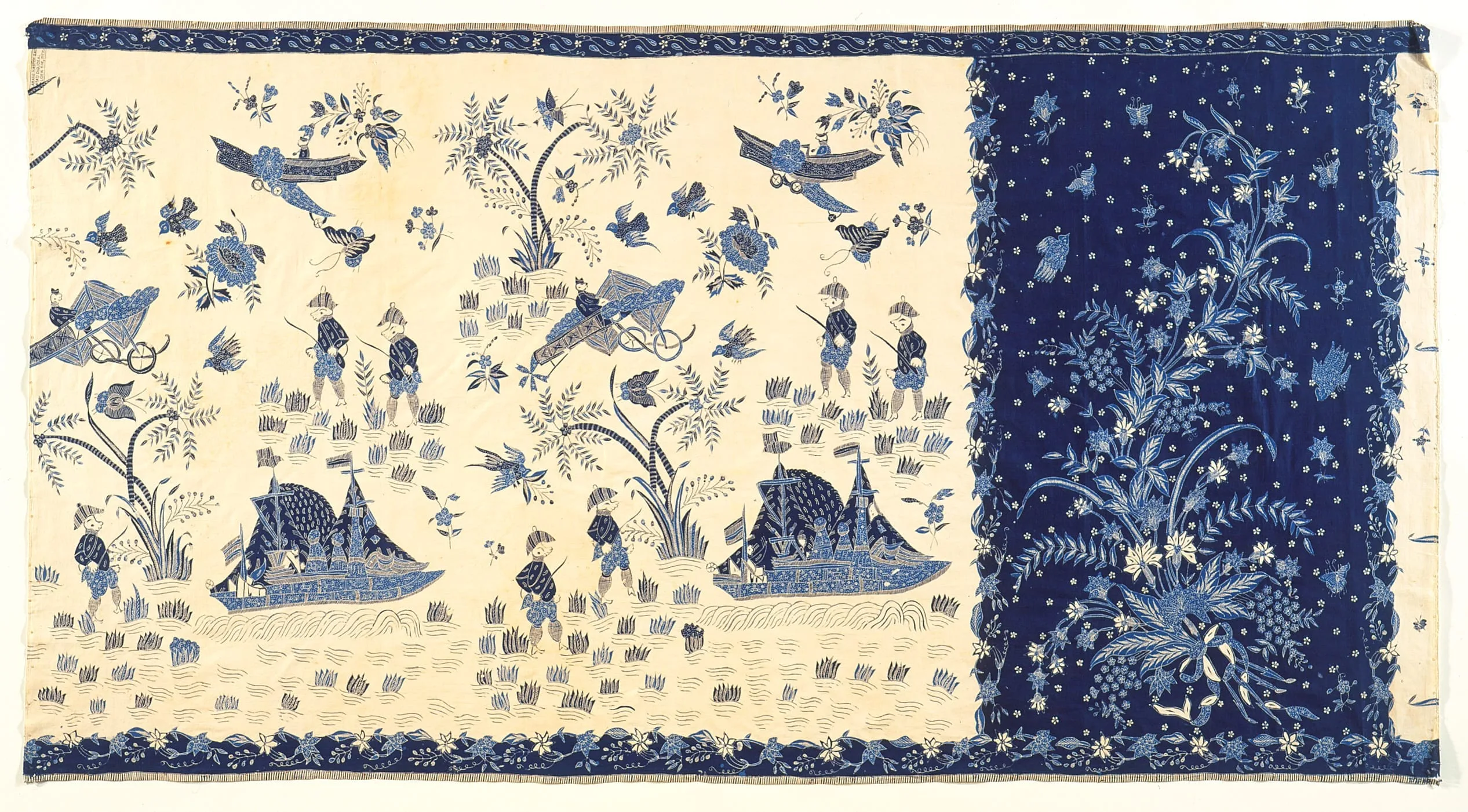 - Hand-drawn wax resist (batik) on machine-woven cotton, synthetic indigo, stamped signature