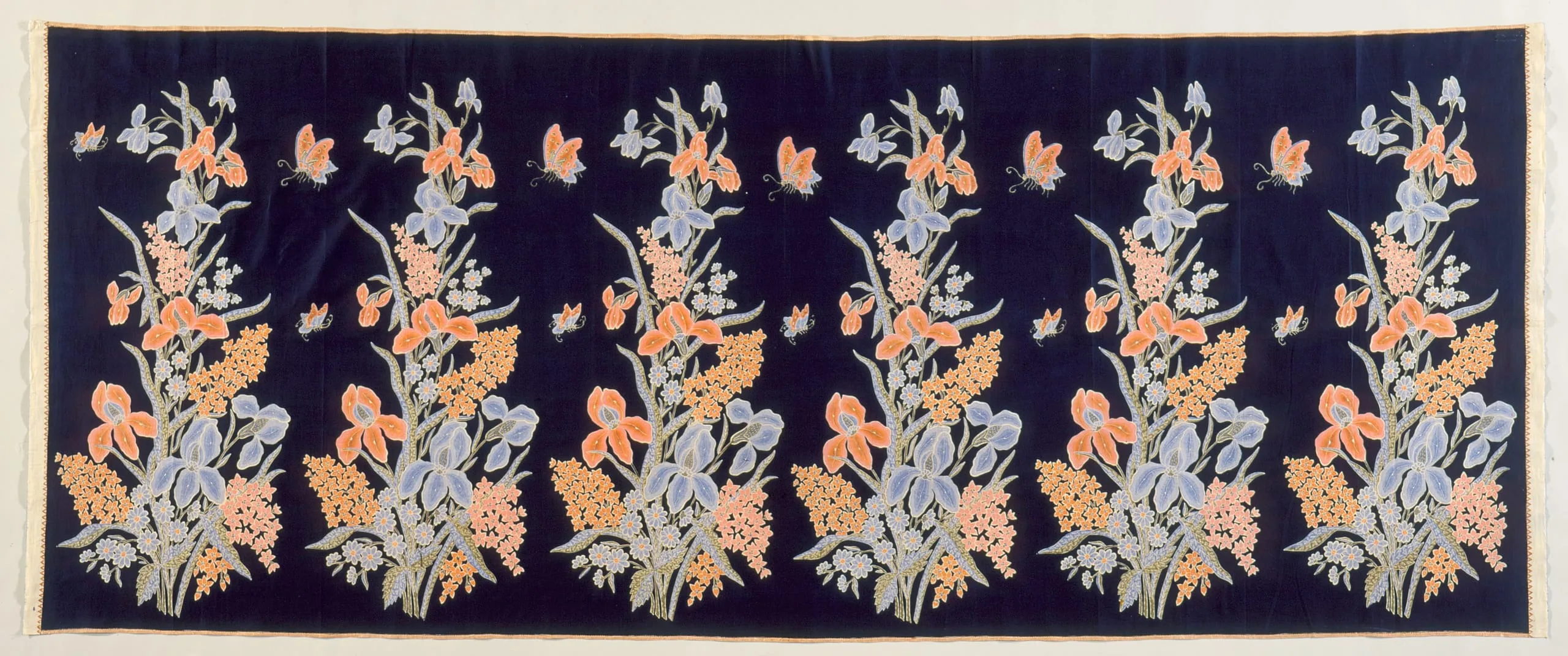 - Hand-drawn wax resist (batik) on machine-woven cotton, synthetic dyes