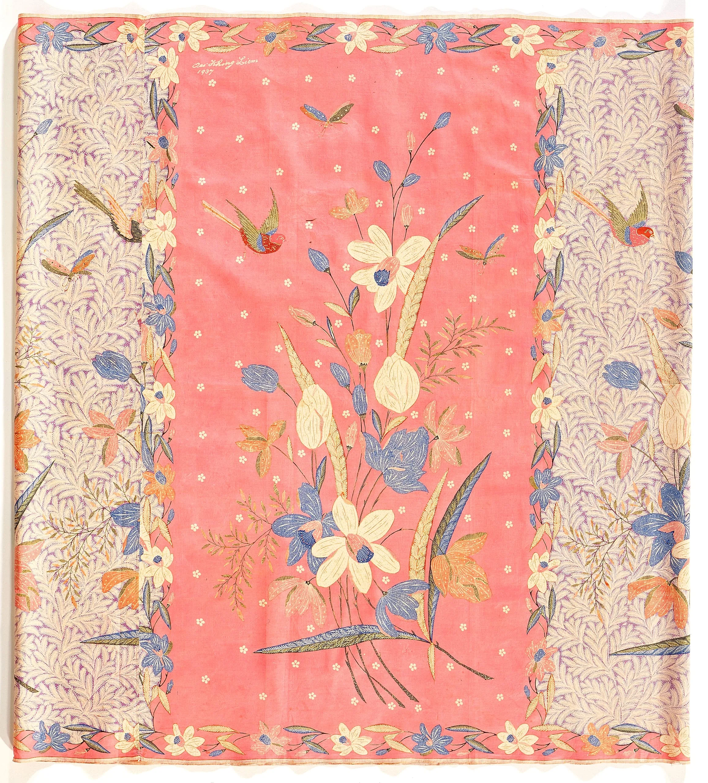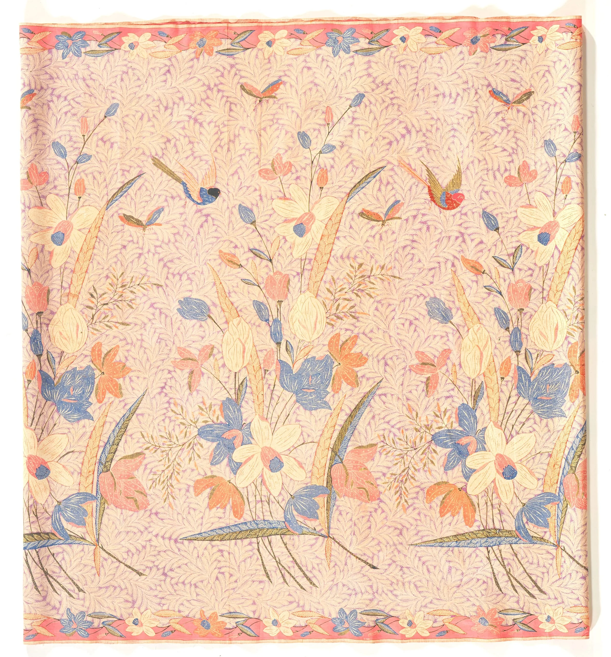 - Hand-drawn wax resist (batik) on machine-woven cotton, synthetic dyes, waxed signature