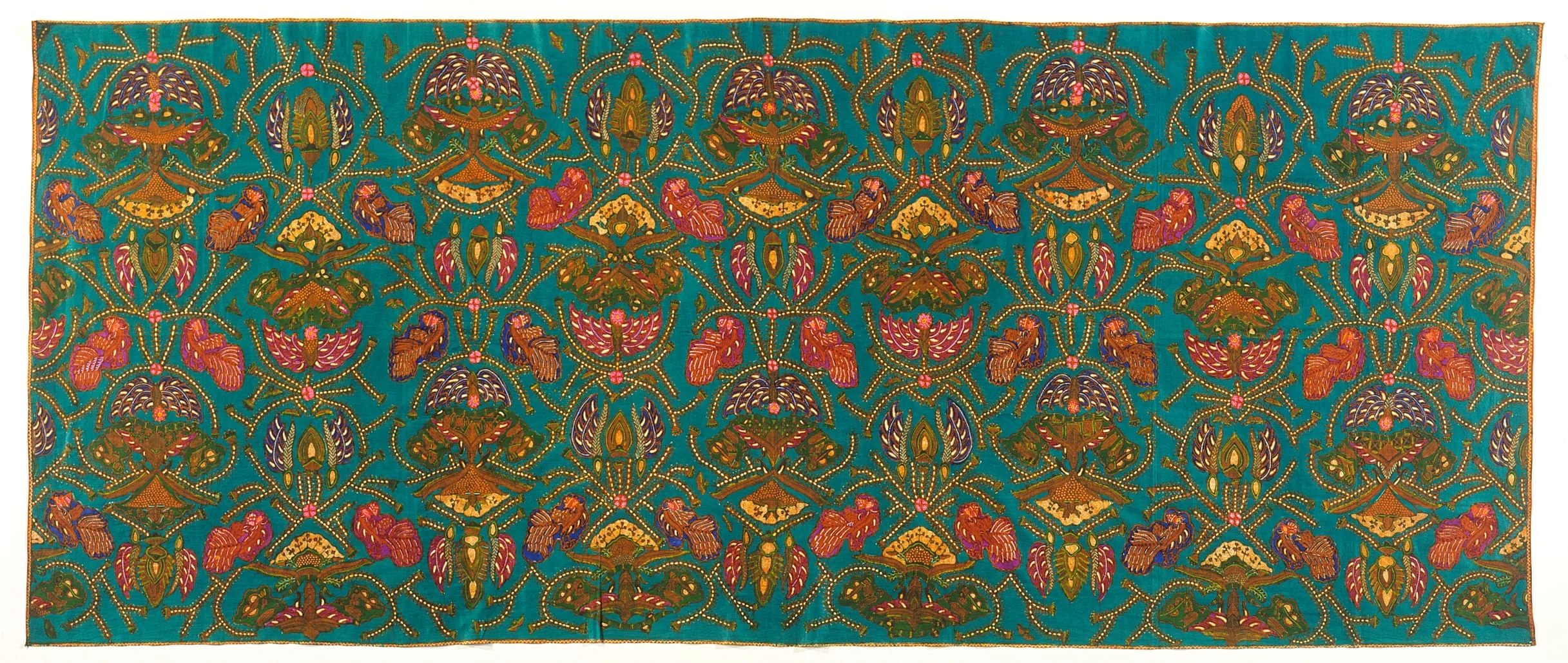 - Hand-drawn wax resist (batik) on machine-woven cotton, synthetic dyes