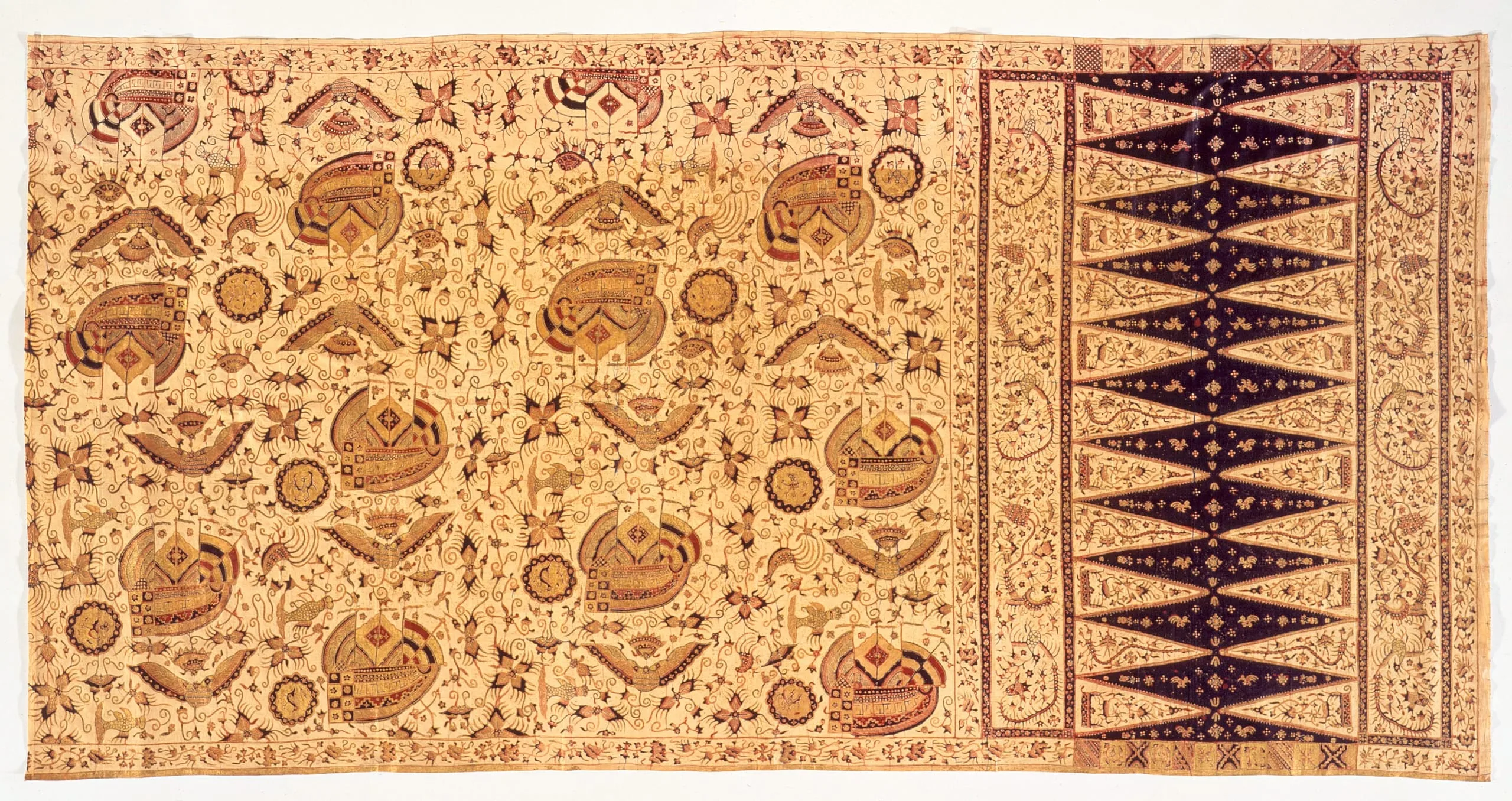In the badan of this asymmetrical cloth three types of heavily stylized, blue, cream, and black rosettes are arranged in diagonal bands on a red ground with banji (swastika) motifs. Until the 1870s such petite designs were the fashion. In Sumatra, however, this early style persisted into the twentieth century. The colors and motifs in each section of the kepala and the borders divide the cloth into two sections, characteristic of a kain sisihan. This particular color combination is named bang biru: one end section has a red ground; the other, blue-black. Centipedes and jellyfish wind their way among floral elements on a white-based papan. At the other end abstracted birds nip at clustered flowers, set off by feathery, white accents that add a vibrant effect against the bright blue ground. The same feature occurs in one of the borders. Rows of small, white starflowers fill the end sections of the kepala, running into the spaces between the triangles.