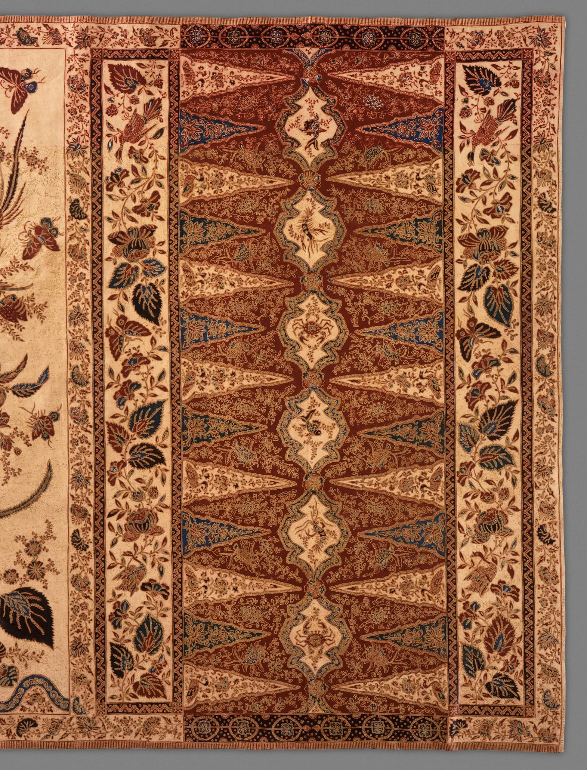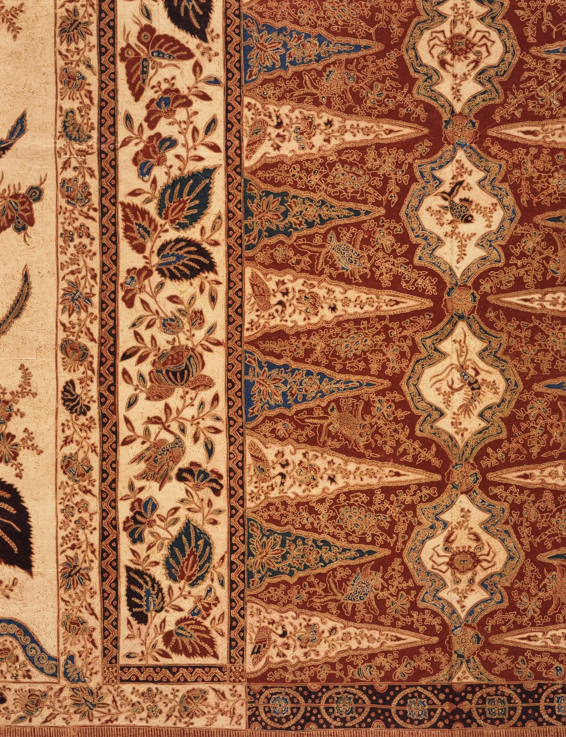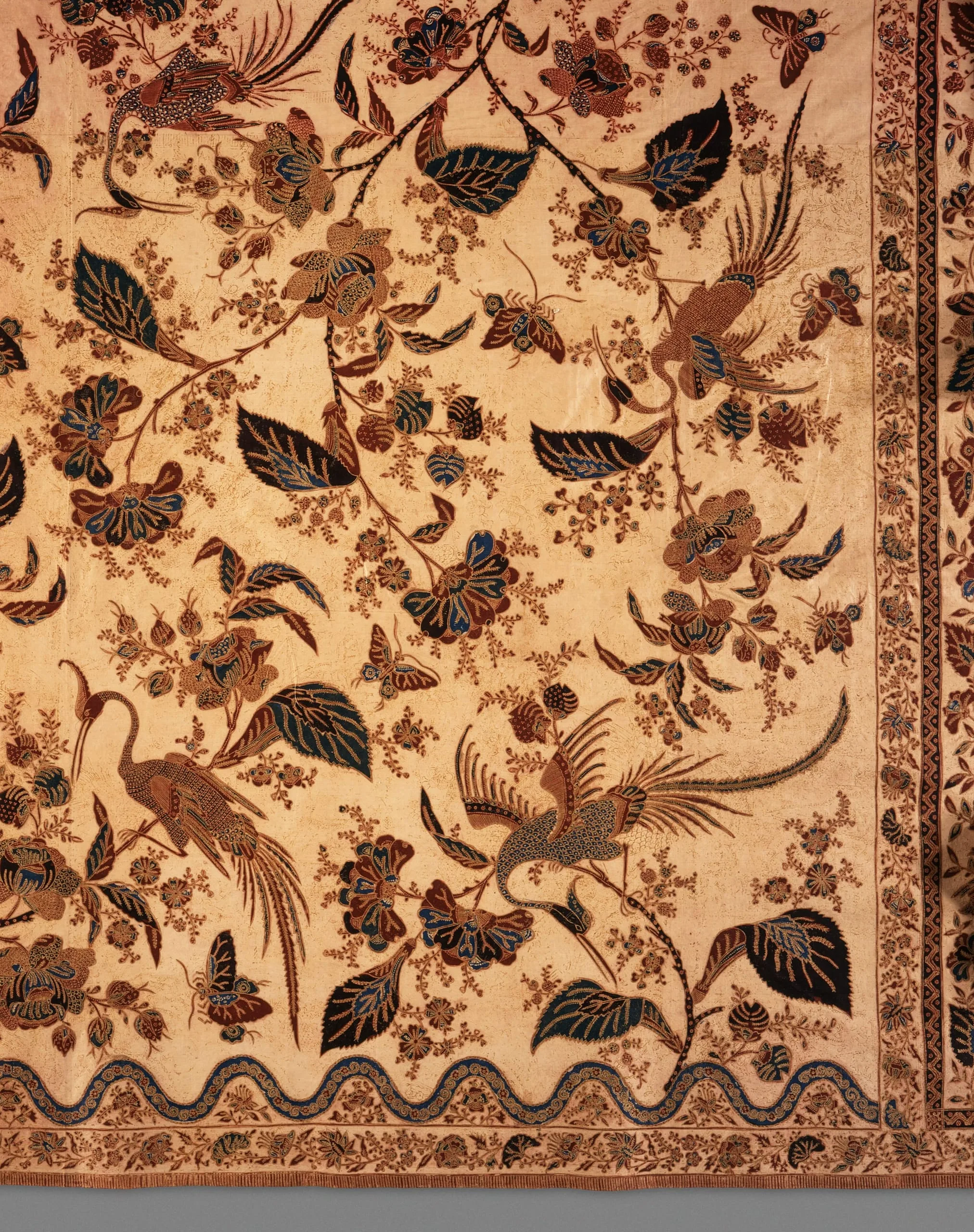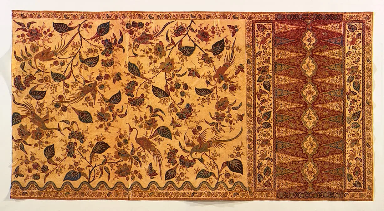 Large egrets perched among the branches of the tree of life mirror each other across the badan. Some of the large leaves are depicted in a European, three-dimensional manner. Floral sprigs decorate the intervening spaces. The kepala shows a baroque treatment of the diamond outlines: “Europeanized,” lengthened, and each enclosing a water creature, which is, however, depicted in Pasisir style. The tumpal rows are filled with small trees on alternately cream and green backgrounds. The red base of the kepala is elaborately decorated. The badan shows red, blue, yellow, the famous Von Franquemont green, and black on a cream ground and has a refined application of gold dust. A European interpretation has been given to the traditional Pasisir lower border.