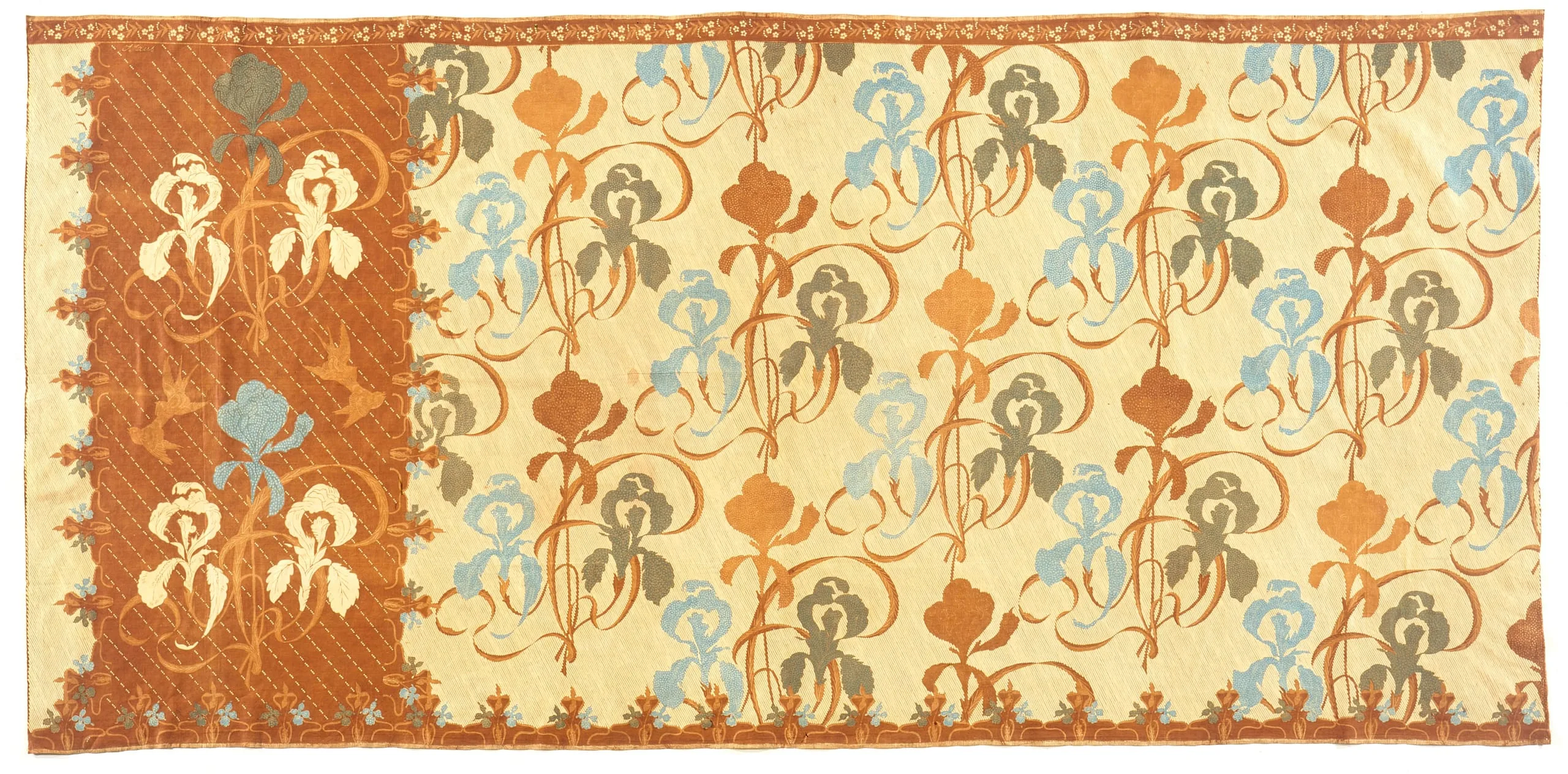 On the badan of this beautiful batik large irises in soft blue, green, and tawny are combined with elegantly curling leaves in a design that reveals an art nouveau source. Perfectly executed galaran cover the beige background, here used as a purely decorative device. In the kepala two sets of clustered irises and pairs of flirting swallows decorate the dark brown ground marked with diagonal nitik lines. The border design follows the Indo-European asymmetrical division: the upper consists of a variation on the simple floral band; the lower is embellished with clusters of small orchids, but in perfect accordance with the rest of the design. Note the extra space next to the kepala, permitting the entire kepala to remain visible when worn.