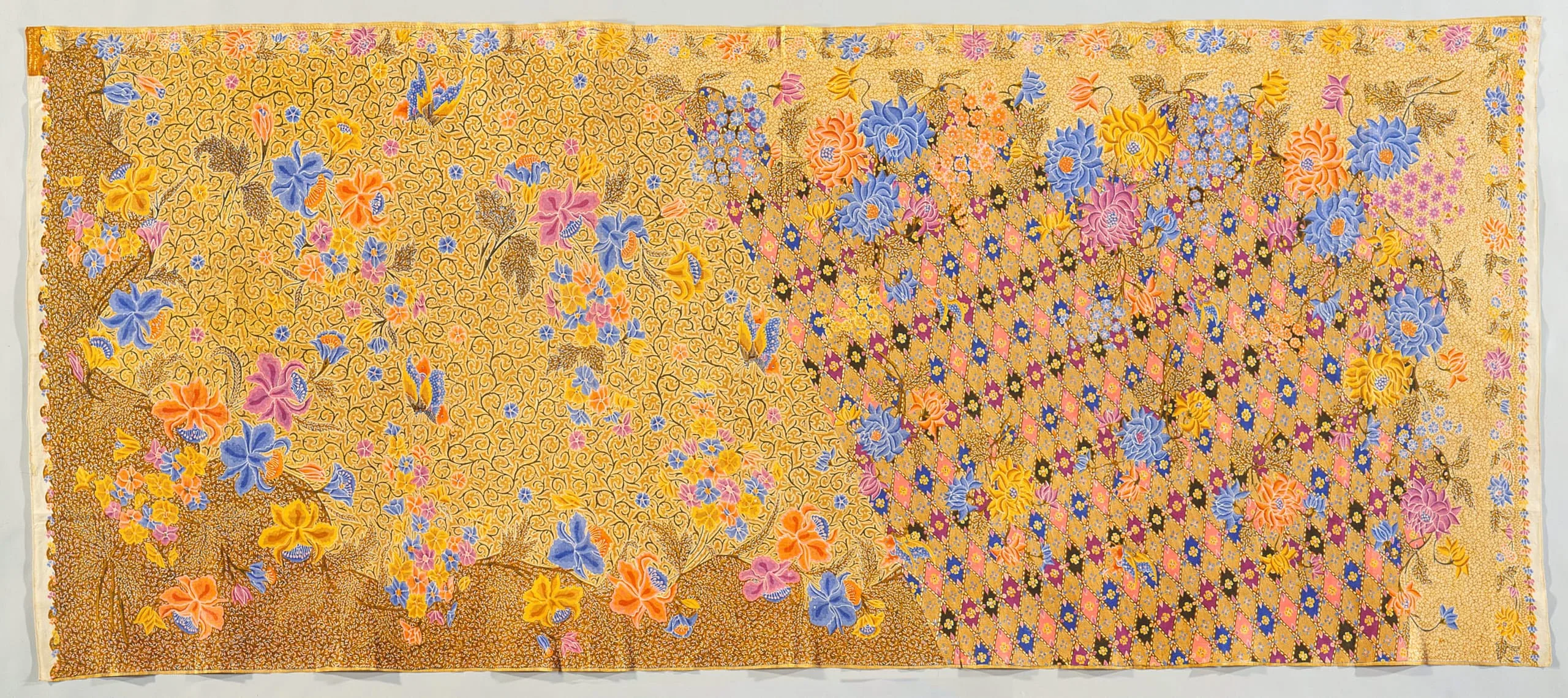 - Hand-drawn wax resist (batik) on machine-woven cotton, synthetic dyes, waxed signature