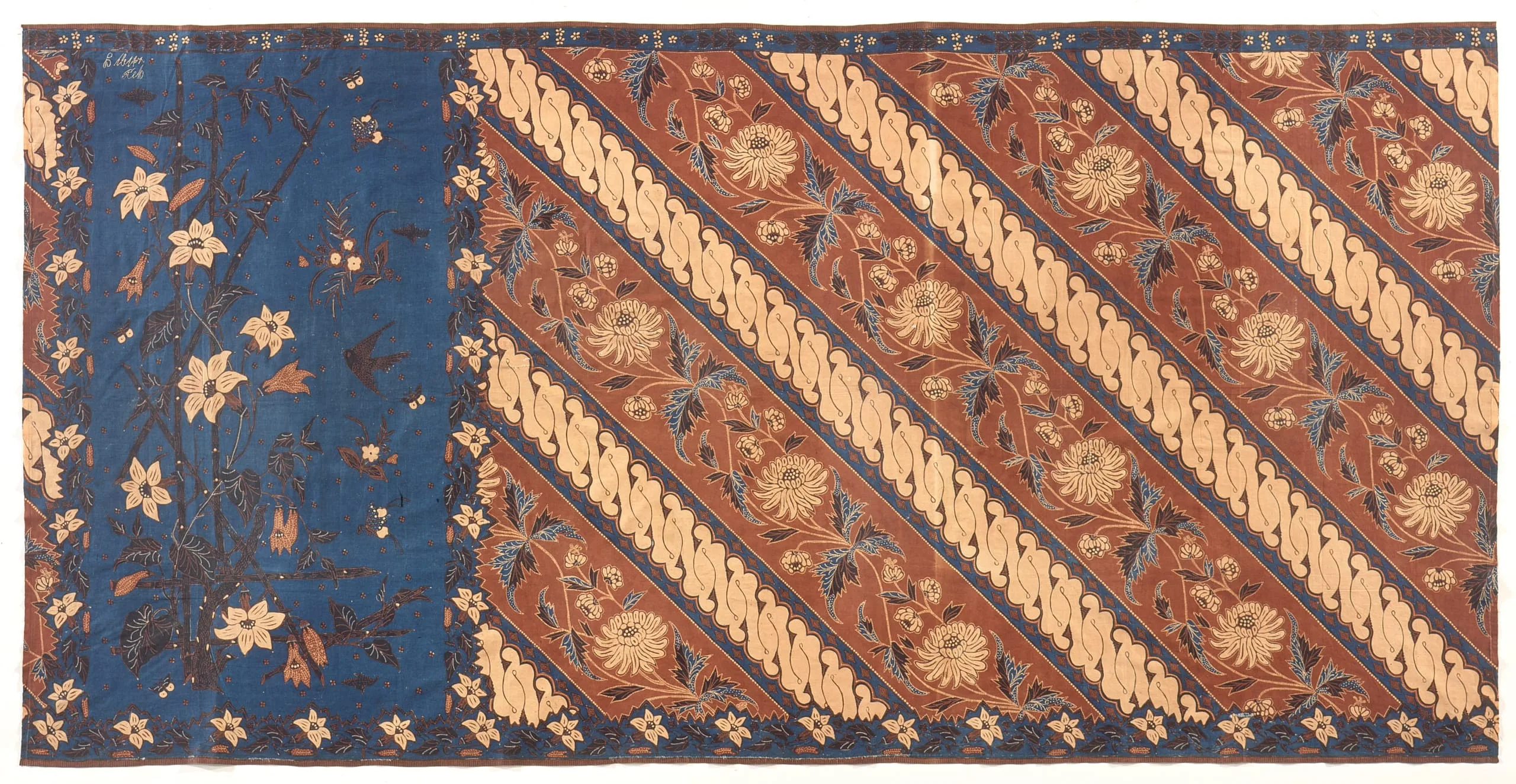 The badan shows a variant of the central Javanese geblak, or dlorong, style, alternating diagonal bands decorated with garlands of chrysanthemums in blue, cream, and black on a soga ground, and a central Javanese parang rusak in traditional colors but slightly altered for wear by nonaristocrats. The kepala, a combination of art nouveau and Japanese design influences, shows a bamboo trellis with white lilies. Rudimentarily drawn birds and butterflies complete the design on a ground of dark blue with a sprinkling of small, four-petaled flowers. The lilies along the lower edge, complementing those of the badan, form an imitation-lace border. The upper border contains a very simple row of clustered flowers.