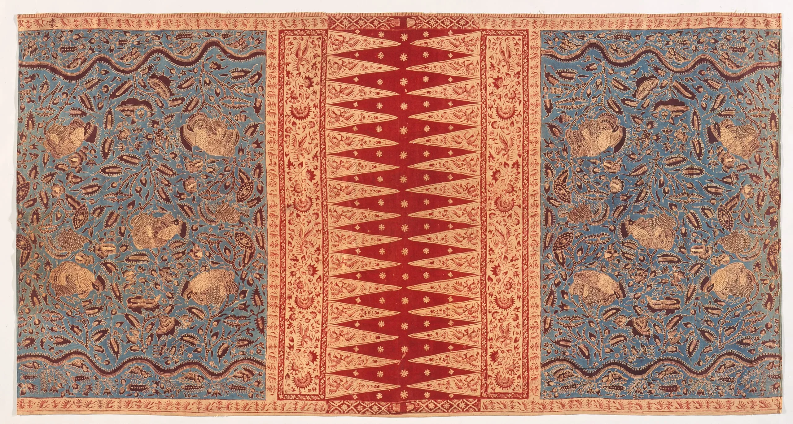 The two badan sections, divided by the kepala, each show five stout gamecocks seated on comparatively delicate branches on a plain, blue ground. Although a horizontal division seems to have been intended, the placement of the central bird in each half undermines this concept. The borders and kepala were executed in Semarang in the traditional Lasem style and contain dainty red flowers and birds with a background of cocohan. The kepala border includes the classical tassels. A rather unusual version of the third border undulates along the upper as well as the lower edge of the cloth, climbing higher toward its ends. The design is a hybrid of motif types, a feature that also emerges in the color treatment. The traditional red-and-cream bang-bangan of Semarang contrasts with a now slightly faded combination of blue and brown in the badan, which continues, somewhat unusually, in the third border.