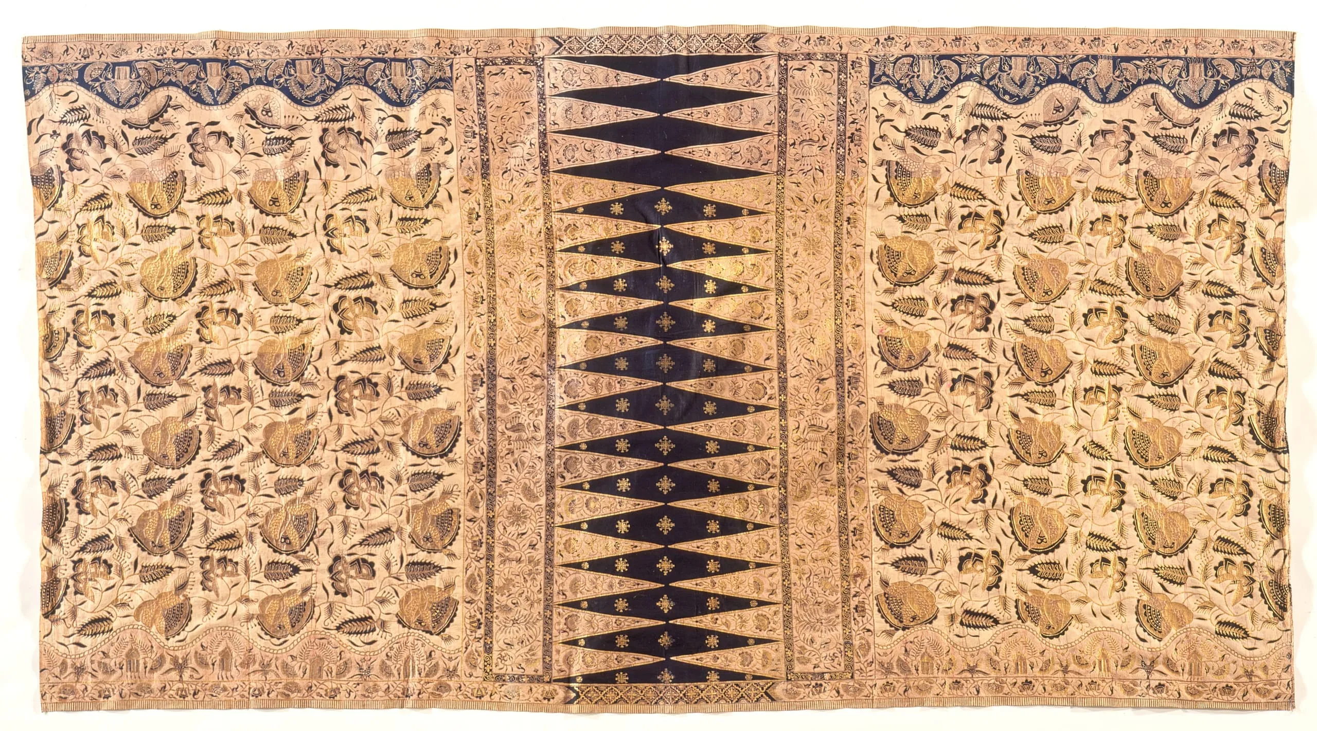 Like the previous examples of sumptuously gilded cloth, this probably was a wedding gift. The unusual amount of gold decoration and the choice for the more appropriate light border to remain visible at the lower, gilded edge suggest its use by a Peranakan bride. The kelengan (blue-and-cream) border as a covering for the lower body, that is, the womb, may well have been intended to impart protective properties. A second possibility is that the cloth was meant to be worn at festive occasions by a grandmother. Not only are the dark tones and predominantly old-fashioned style of the cloth appropriate for an elderly woman, the separate rows of fruits and flowers can also be seen as a metaphor for a grandmother’s position as the source for several successive generations.2