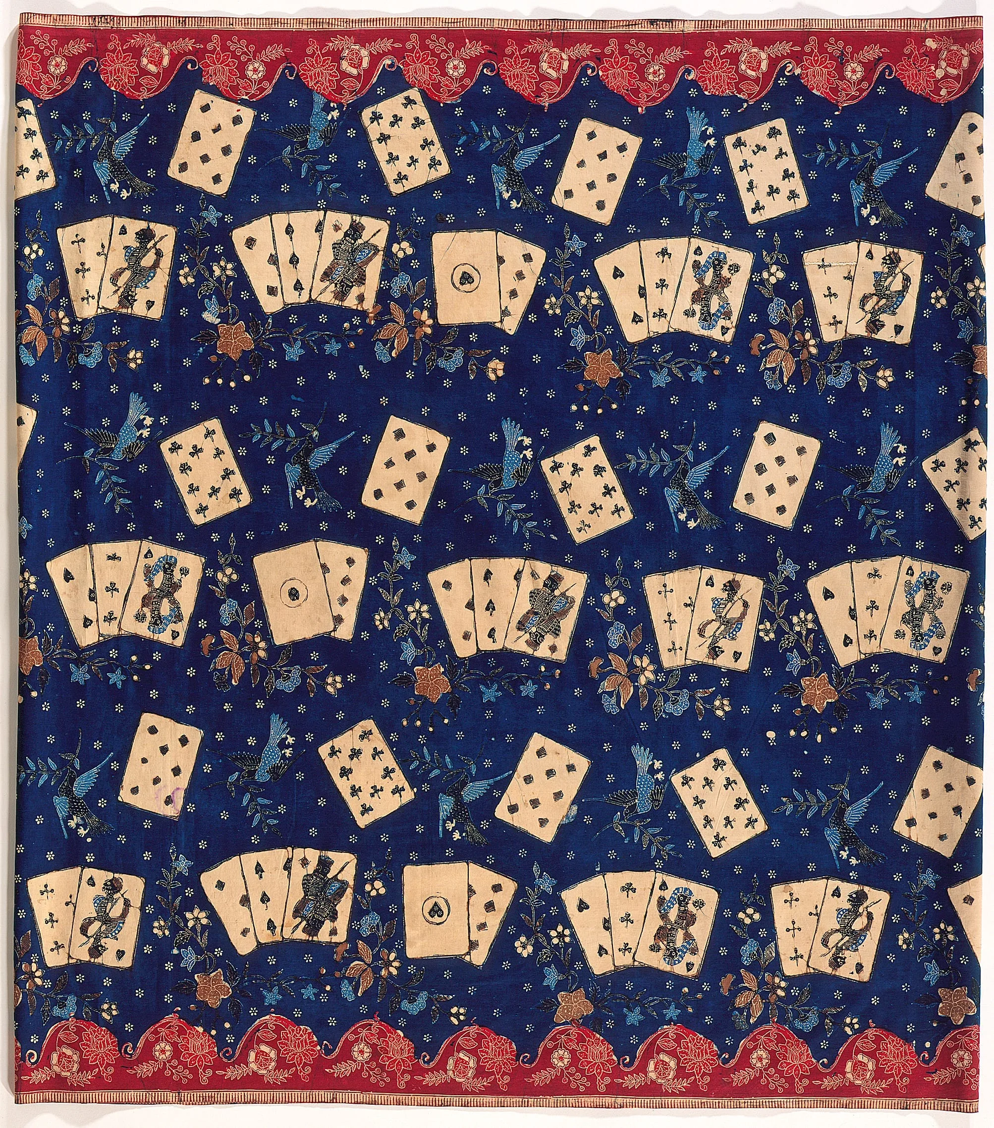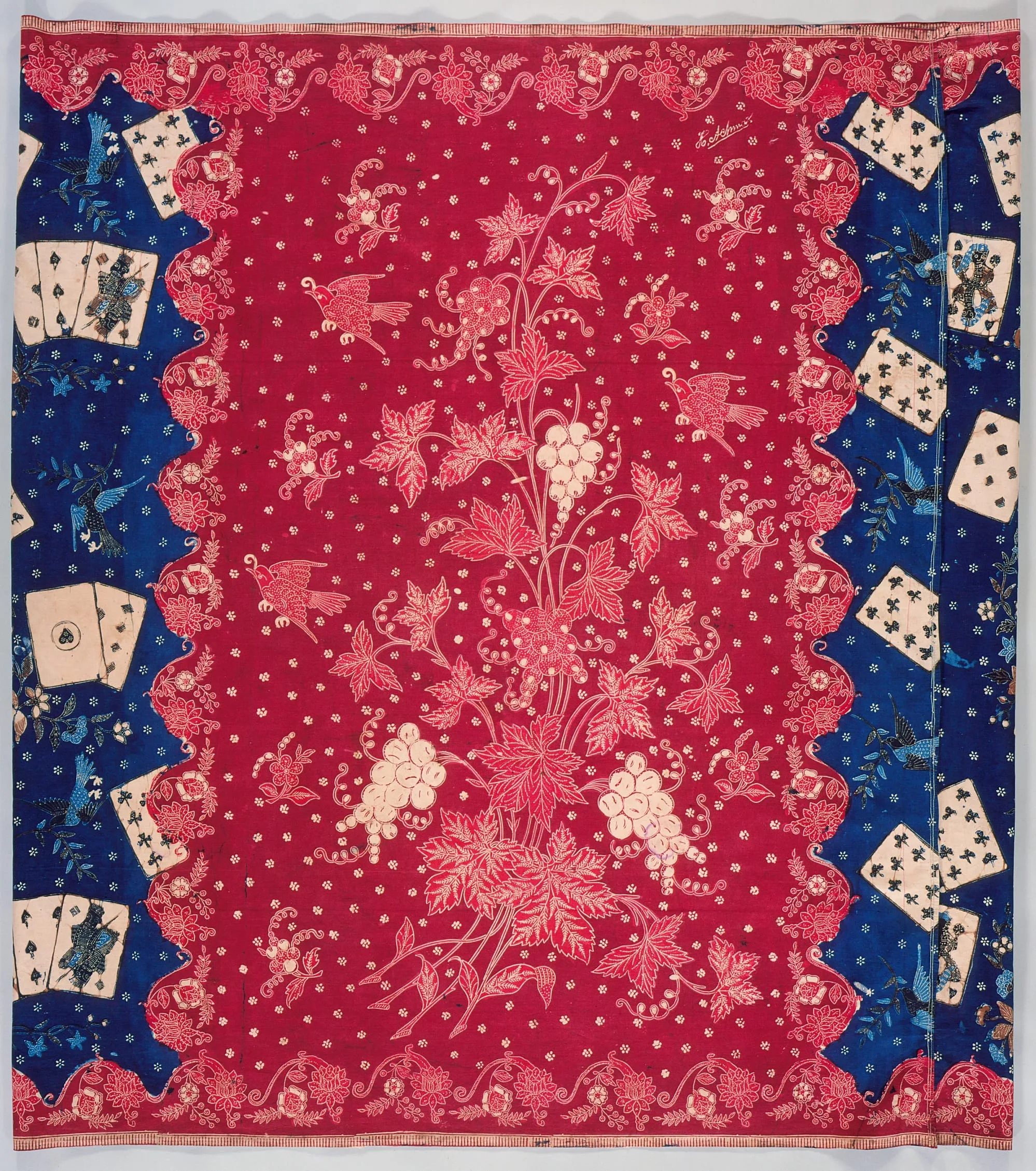 - Stamped wax resist (batik) on machine-woven cotton, synthetic dyes, stamped signature