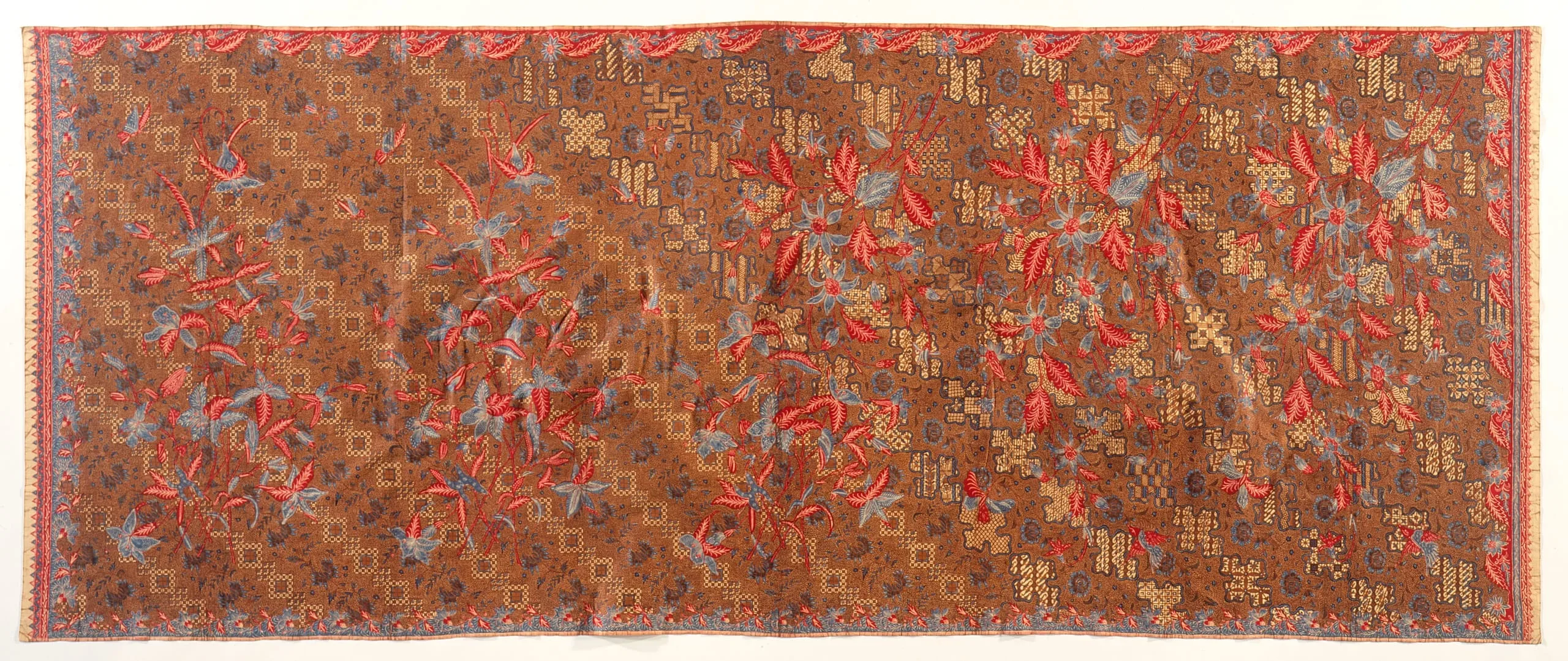 - Hand-drawn wax resist (batik) on machine-woven cotton, natural and synthetic dyes