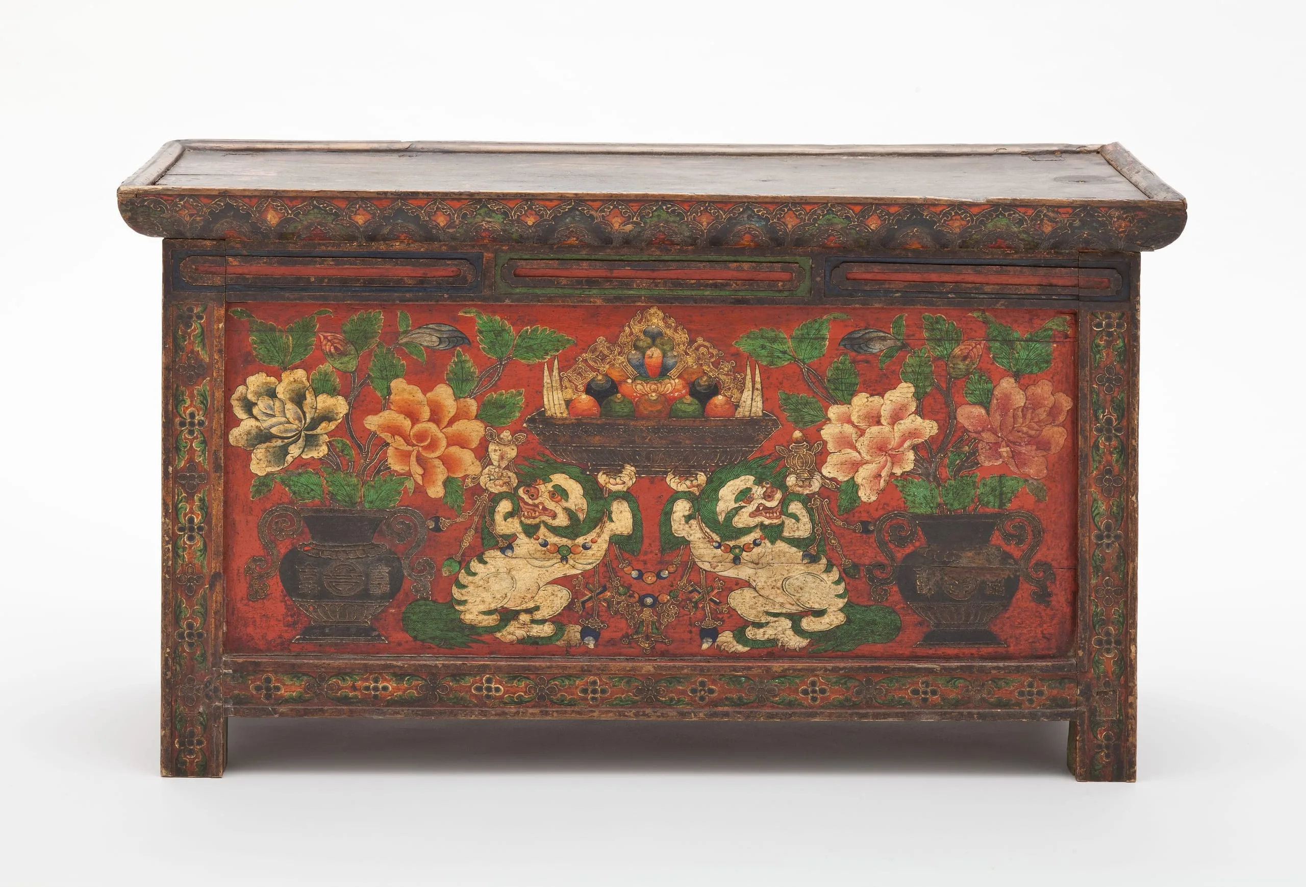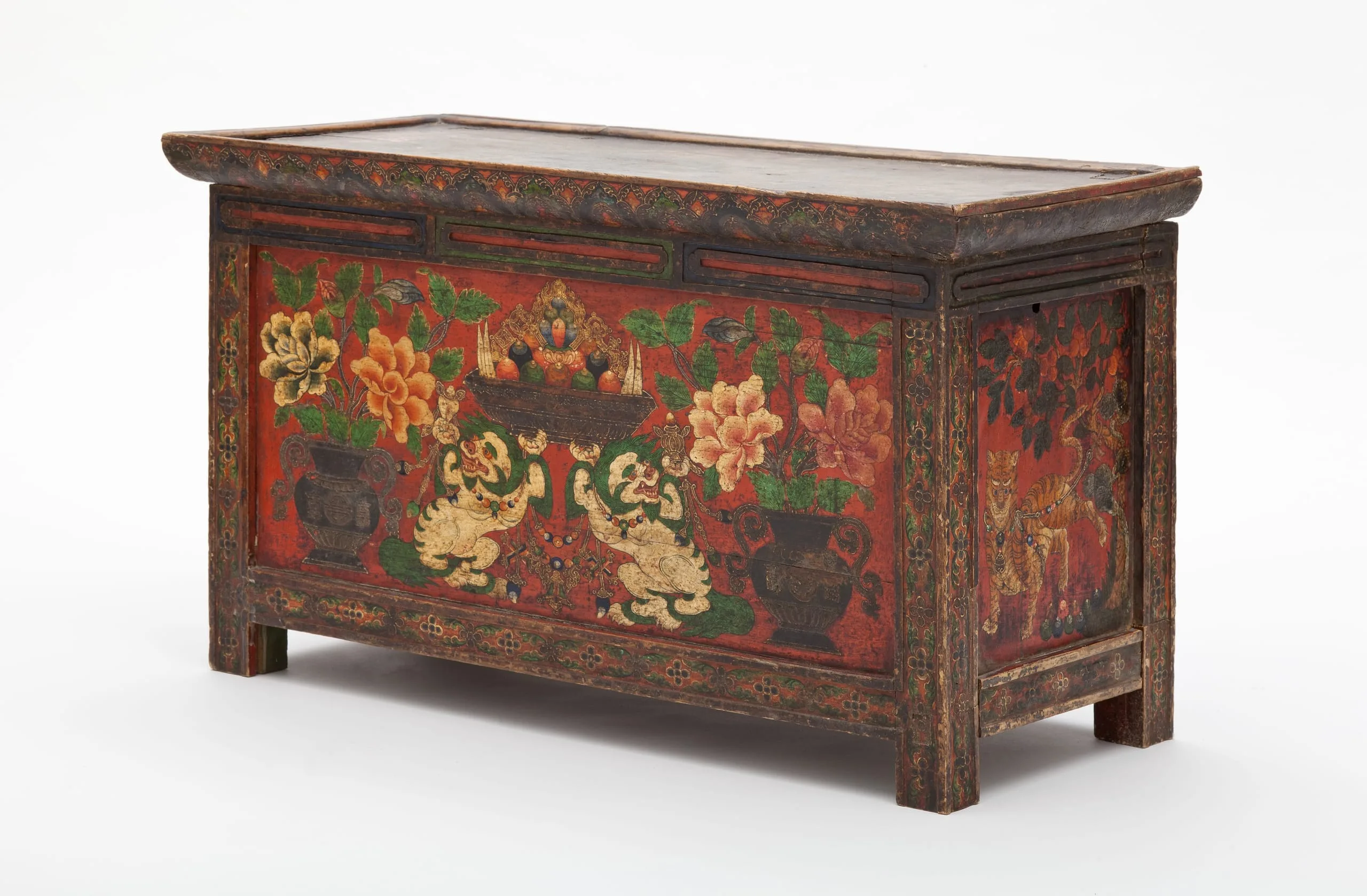 Tables were a quintessential accoutrement in Tibetan monasteries, temples, and shrines in many private homes. They facilitated religious ceremonies by displaying and storing various ritual objects, musical instruments, and offerings, and by supporting sacred texts to be read. See Tony Anninos, "Tibetan Tables: The Evolution of Style and Function," in David Kamansky, ed., Wooden Wonders: Tibetan Furniture in Secular and Religious Life (Pasadena: Pacific Asia Museum and Chicago: Serindia Publications, 2004), pp. 95-105.