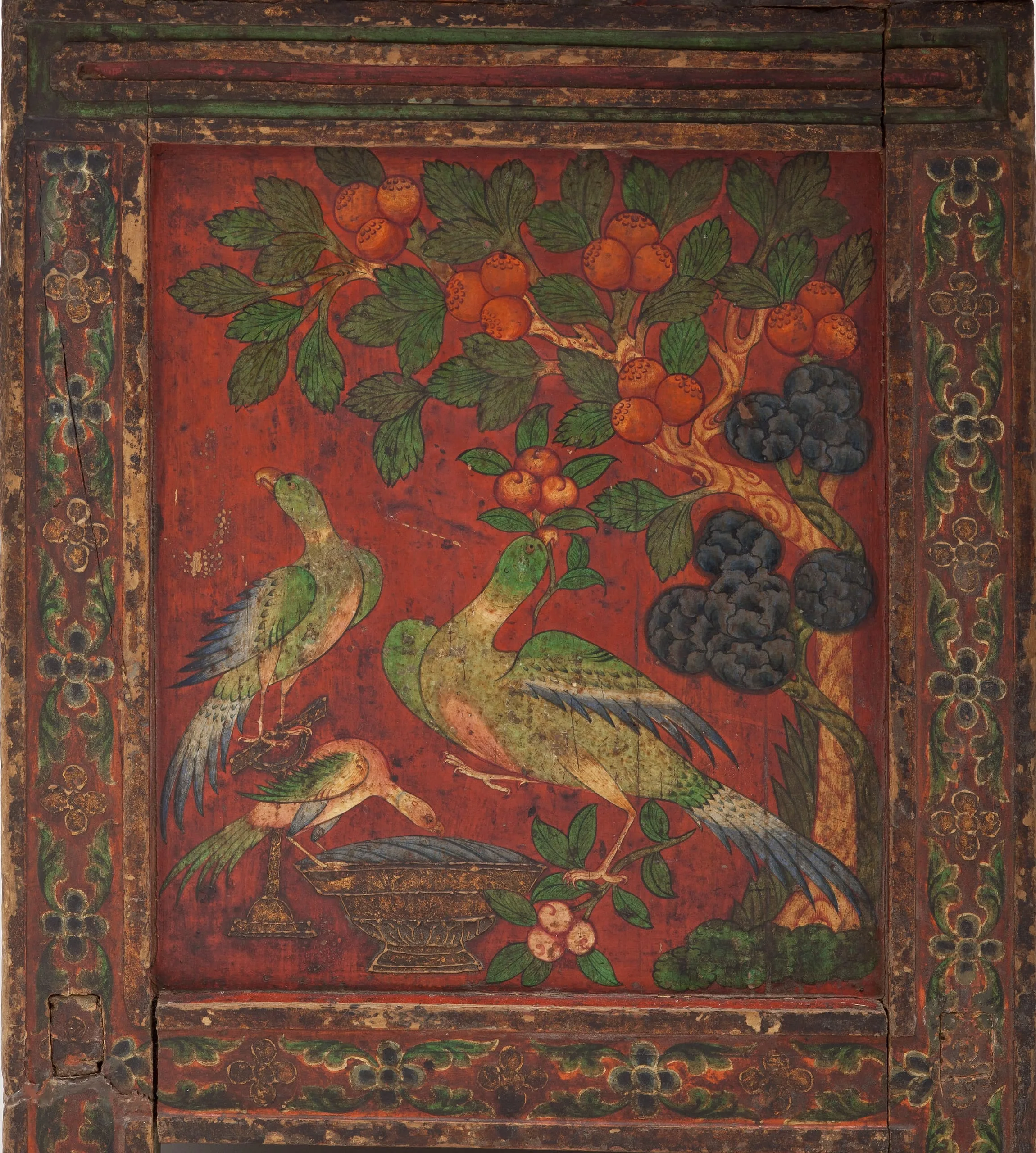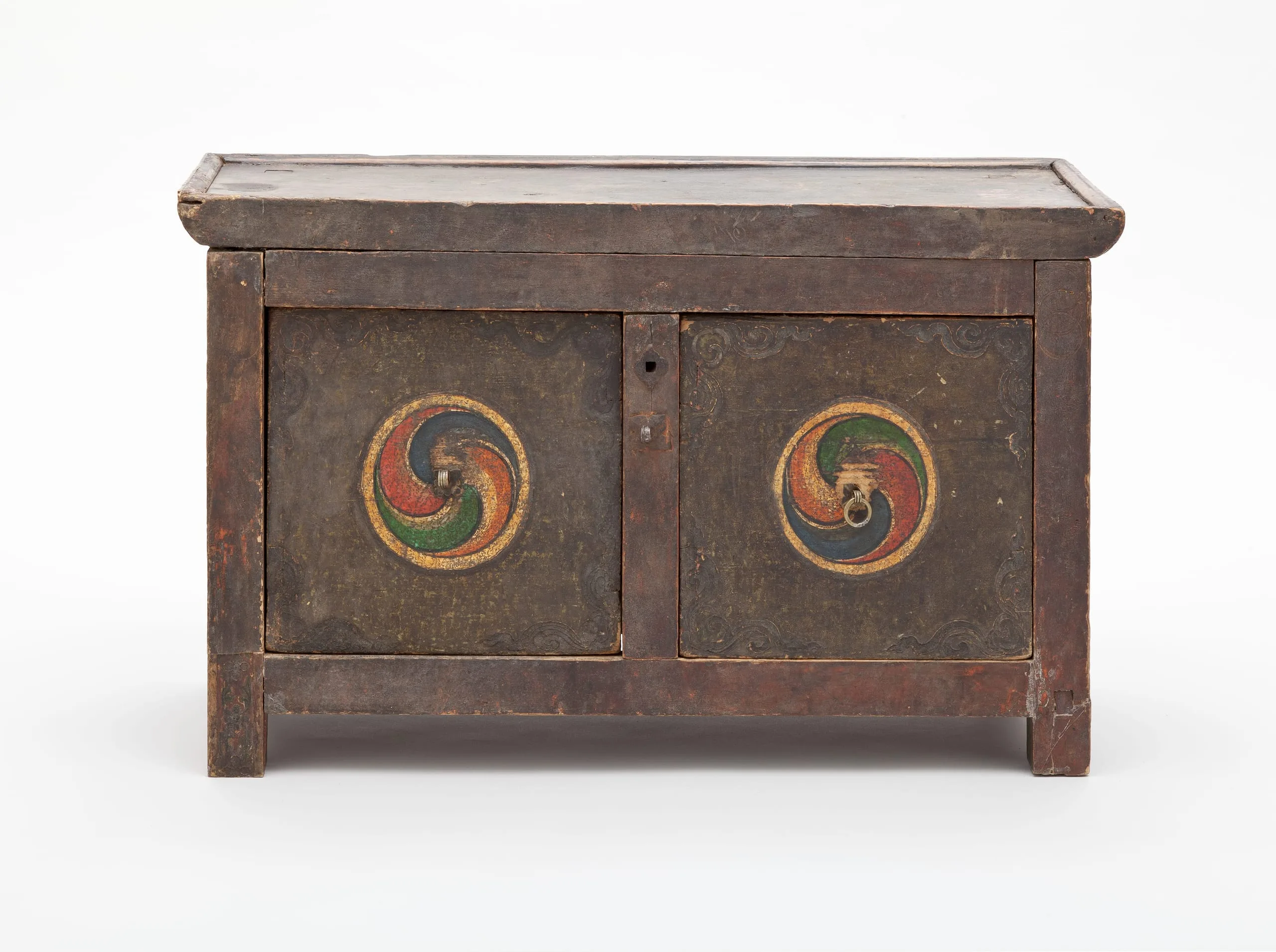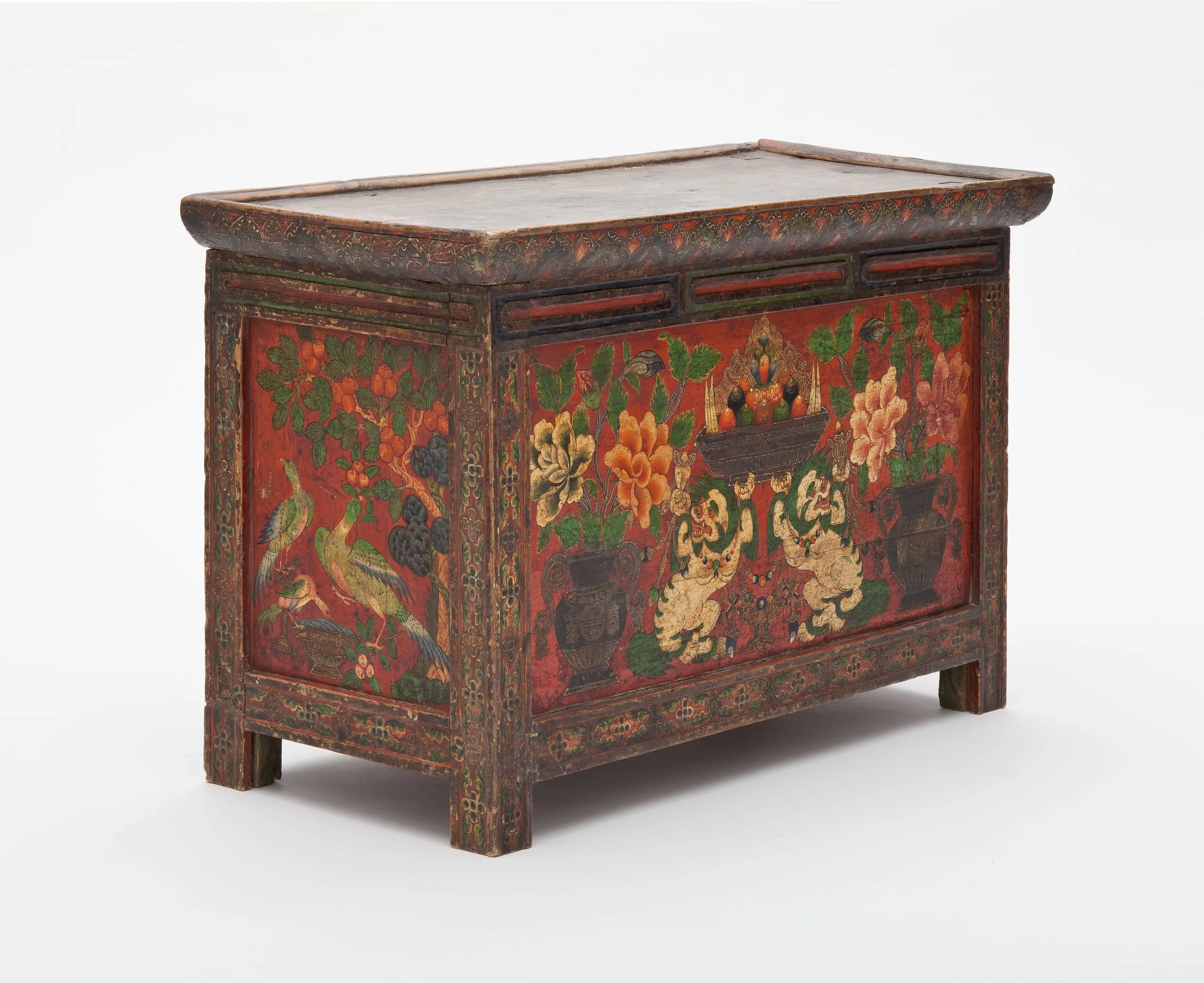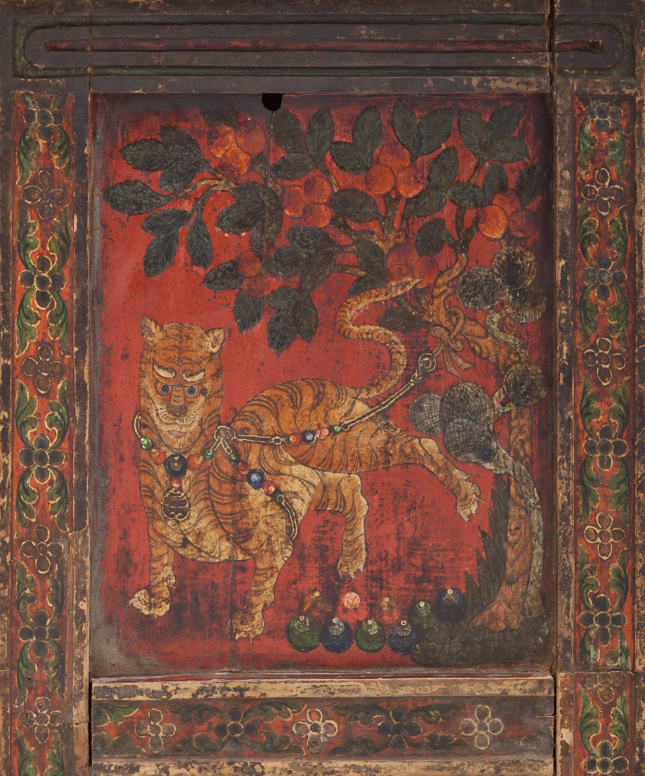 This table is adorned on the front with painted and raised gesso decorations of animated snow lions supporting a bowl of wish-fulfilling gems with their inner paws and an auspicious conch shell and sacred water vessel with their outer paws. An ornamental swag of jewels dangles between them. The snow lions are flanked by a pair of wealth vases (yangbum) that are inscribed with Chinese characters, including the shou character for long life. Each vase is filled with burgeoning flowers. One end panel has three birds perched on a branch, display stand, and the rim of a bowl of offerings. The largest bird is eating fruit or precious gems from the tree above. The other end panel has a prancing tiger tethered to a tree with his hind leg raised. The back of the table has two doors embellished with multicolored yin-yang or taijitu symbols. The multicolored yin-yang symbols are a later conception than the earlier monochromatic yin-yang symbols and symbolize a greater range of creative energies in balance.
