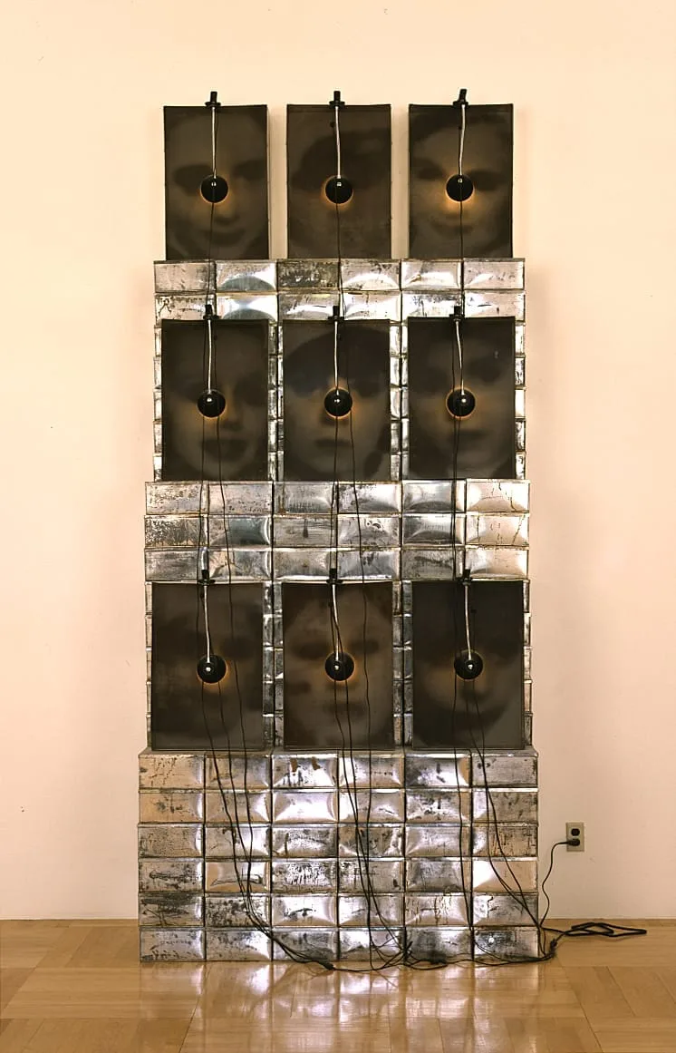 - Mixed media: 246 metal boxes with cloth, 9 metal drawers with photographs, wire, electric lamps, and wires