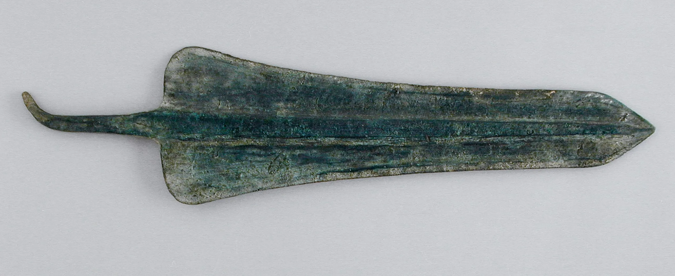 Bronze blade or spearhead with leaf-shaped base and central ridge, heavily patinated in green and gray tones