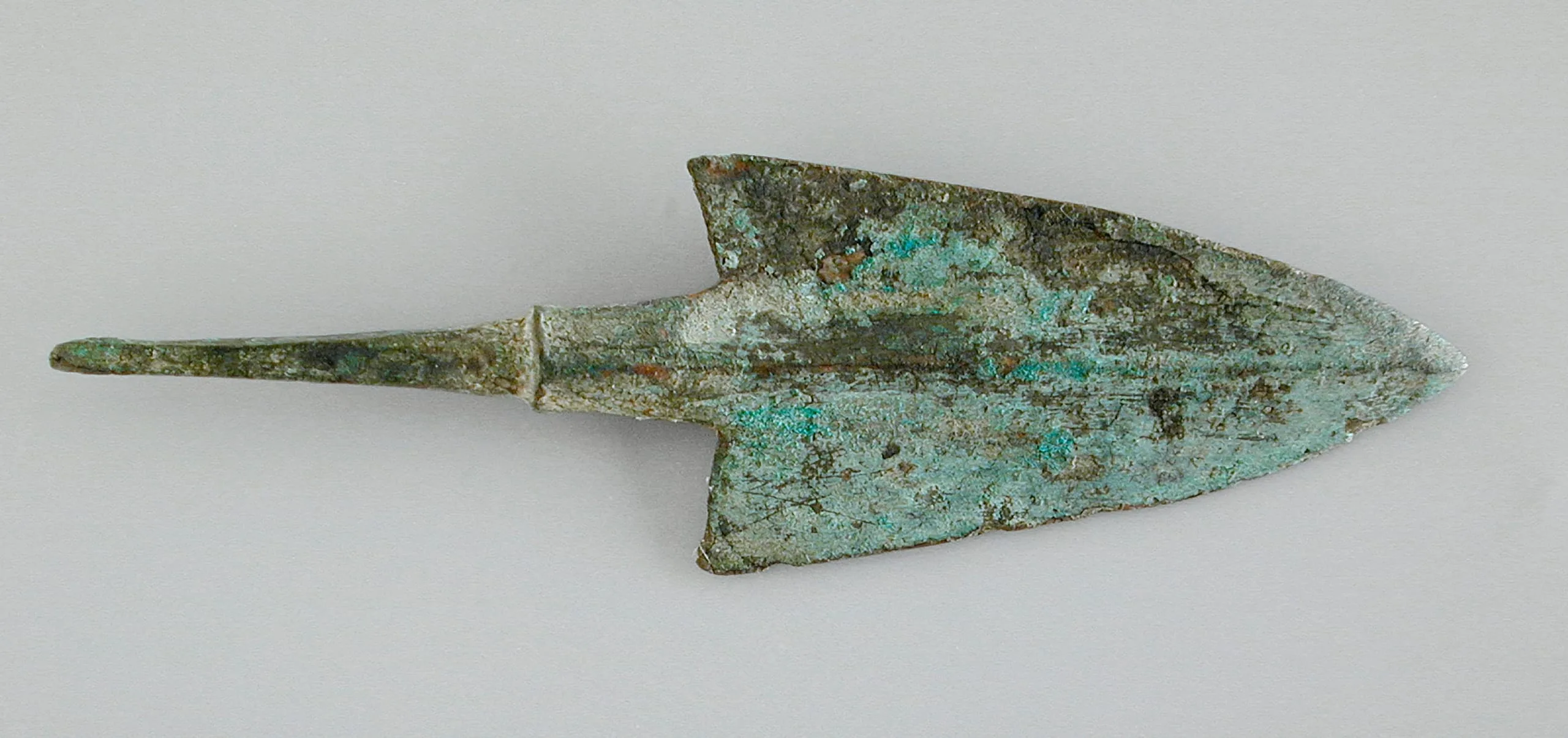 Bronze spearhead or arrowhead with leaf-shaped blade, swept-back barbs, and central rib, covered in olive green and turquoise patina