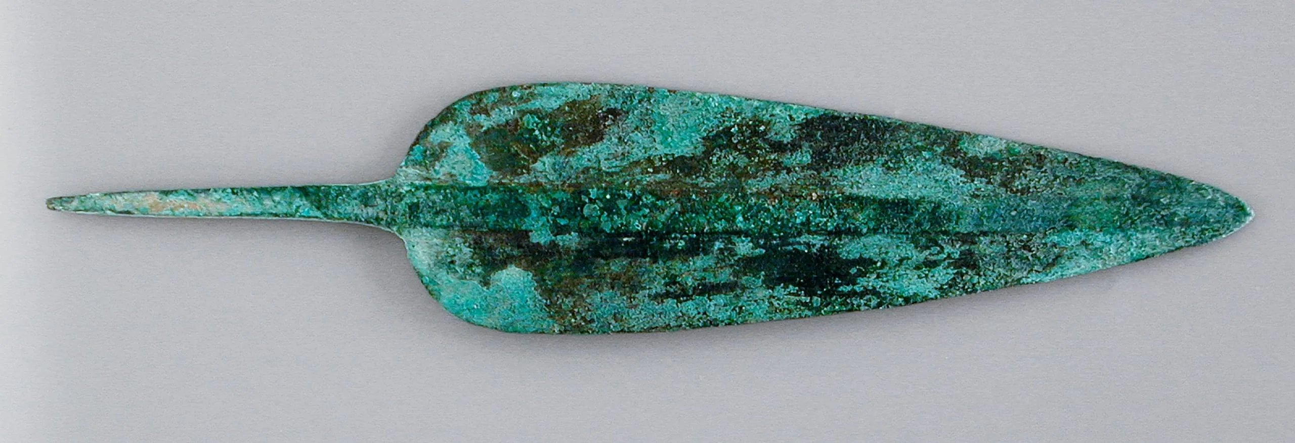 Bronze spearhead with leaf-shaped blade and narrow tang, heavily patinated in turquoise and dark green with a raised central rib