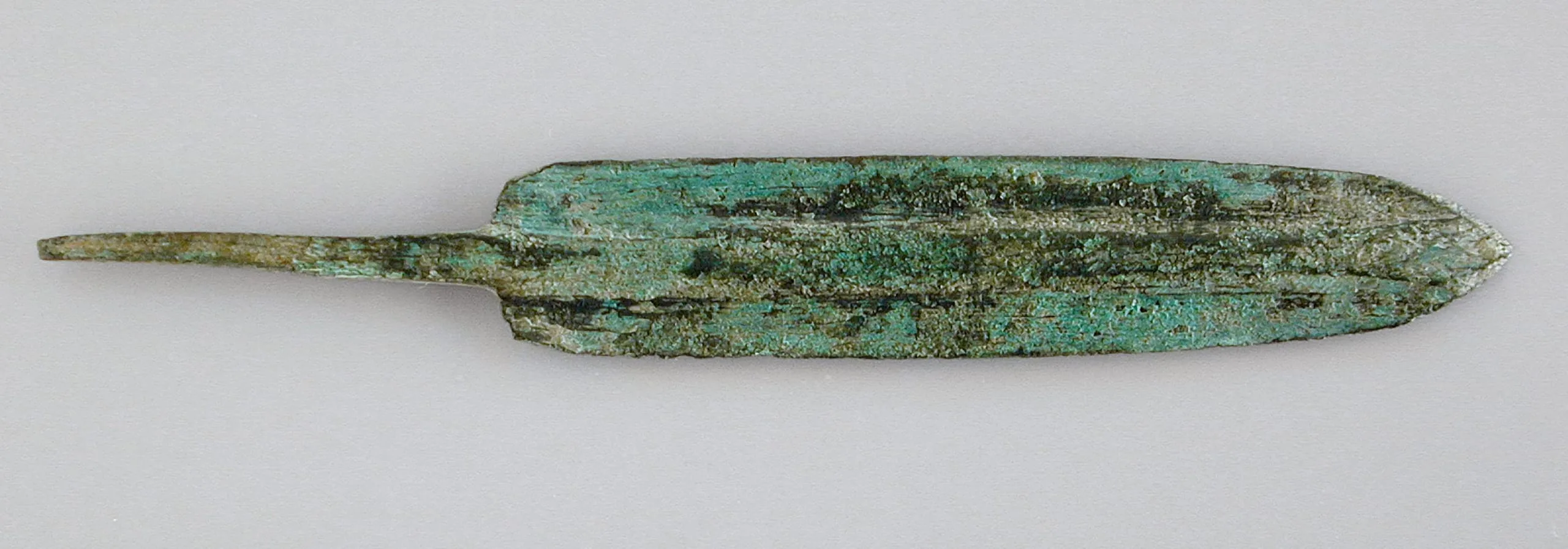 Ancient bronze blade with leaf-shaped profile and raised central ridge, heavily patinated in turquoise and olive green with rough, corroded surface