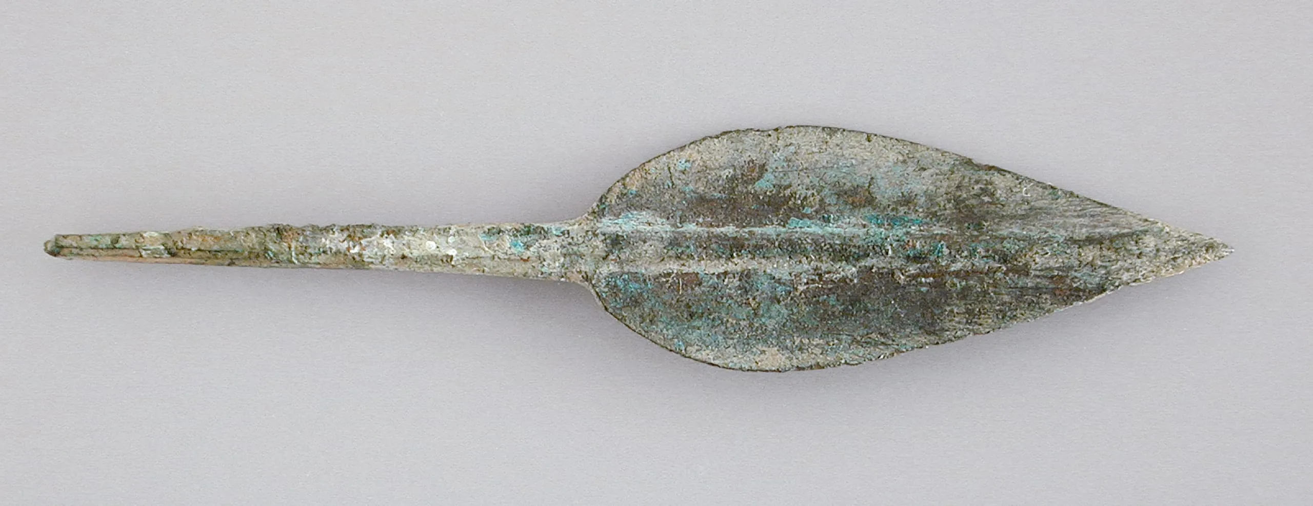 Bronze spearhead with leaf-shaped blade and raised central ridge, heavily corroded with olive brown and turquoise-green patina