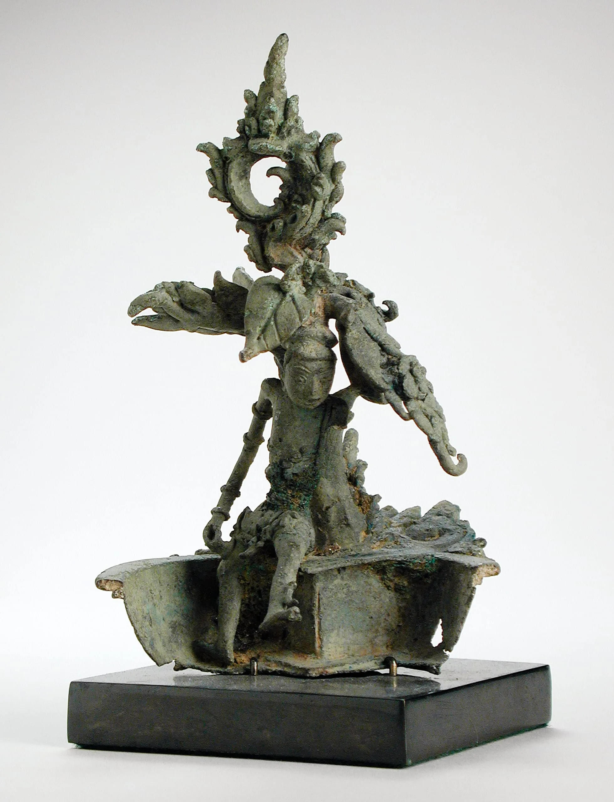 Ornate oil lamps may have entered the artistic traditions of Southern Asia through early trade contact with Roman and Byzantine oil lamps. They have long been used in places of worship and for domestic rituals by adherents of all the major religions throughout the diverse regions of South Asia, Southeast Asia, and the Himalayas. Burning oil lamps help demarcate and purify a sacred space, and they can symbolize a practitioner’s enlightenment. Typically made of brass, bronze, or earthenware (see M.84.213.62), they can be hung from chains such as this example (see also 78.10, M.89.101.4, and AC1992.271.1), mounted on pedestals (see M.79.152.50a-b and M.78.23a and .23b) or stands (see 82.5, M.84.227.8, M.89.101.4, AC1993.152.1, and AC1995.152.1), or hand-held (see M.91.204). The fuel can be animal fat, such as clarified butter (ghee), or various plant-based oils that is contained in reservoirs or small burner dishes often ovate in shape with depressed corners. The fuel is ignited with a protruding or floating fiber wick. Figural oil lamps were fashioned in a wide variety of conceptual forms, including anthropomorphic, zoomorphic, phytomorphic, abstract, and combined creations. See Sean Anderson, Flames of Devotion: Oil Lamps from South and Southeast Asia and the Himalayas (Los Angeles: UCLA Fowler Museum of Cultural History, 2006).