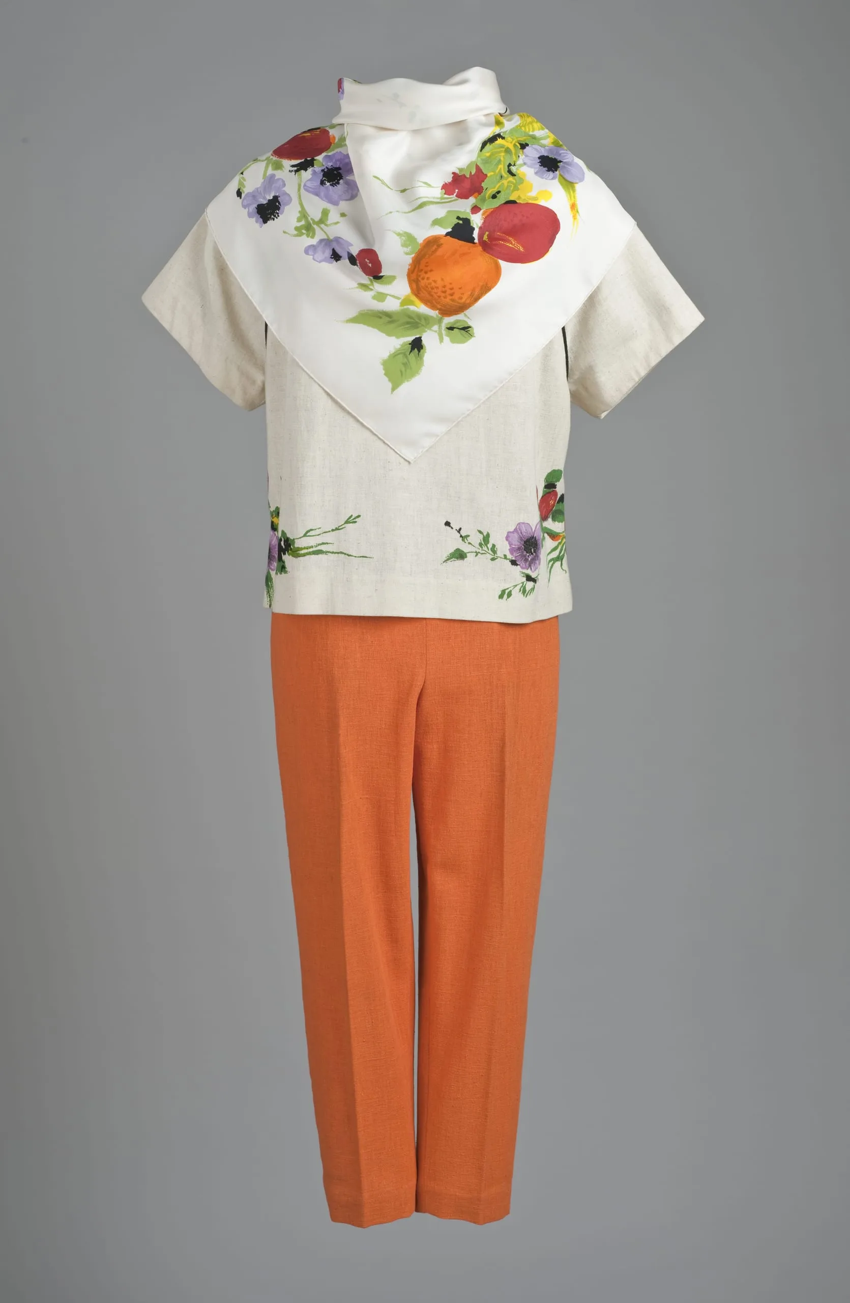 - a) Dress: Linen plain weave, printed, linen plain weave; b) Blouse: Linen plain weave, printed, with linen plain weave trim, and bamboo buttons; c) Pants: Linen plain weave; d) Scarf: Silk twill, printed.