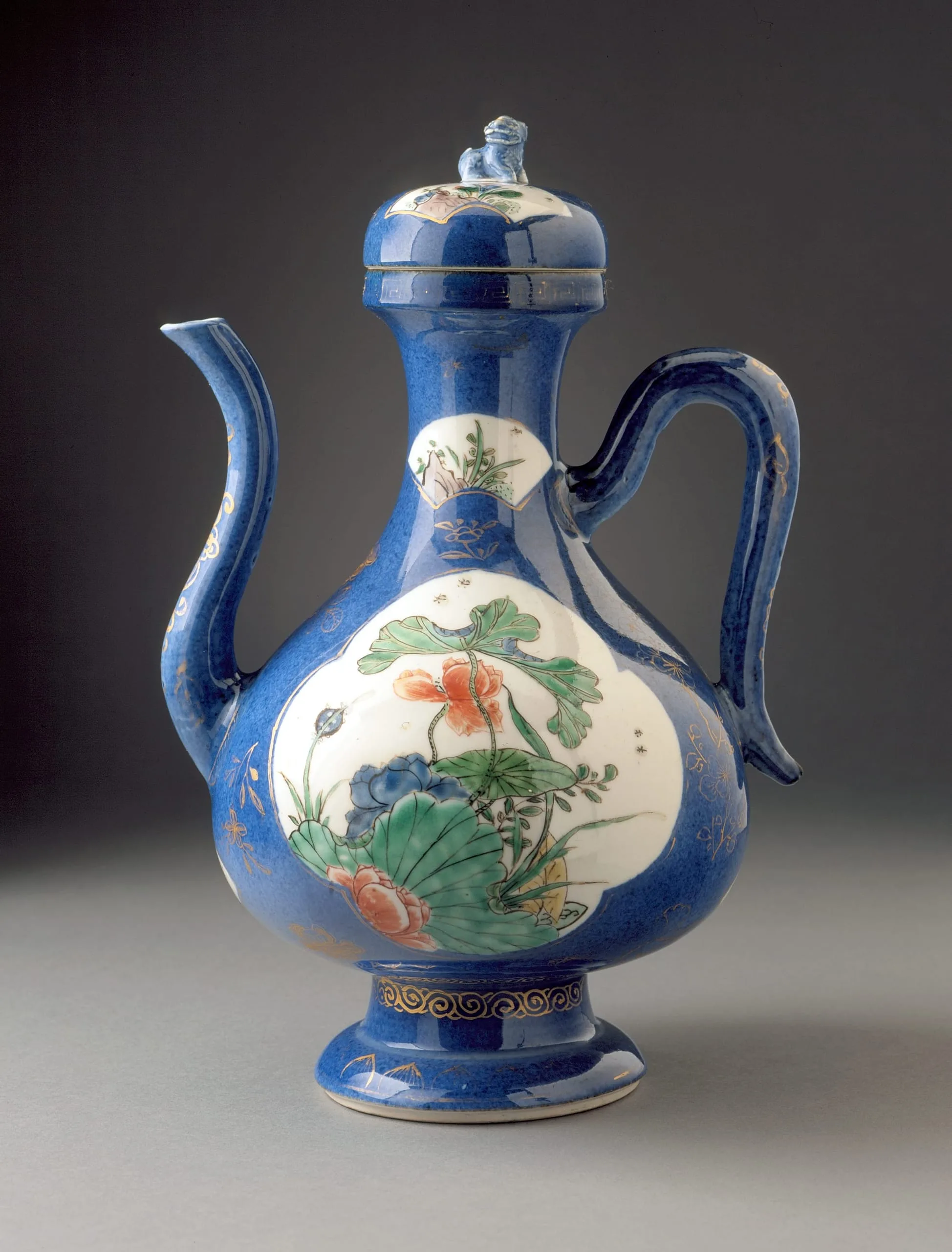 - Wheel-thrown porcelain with powder blue glaze, overglaze painted enamel decoration (wucai), and gilding