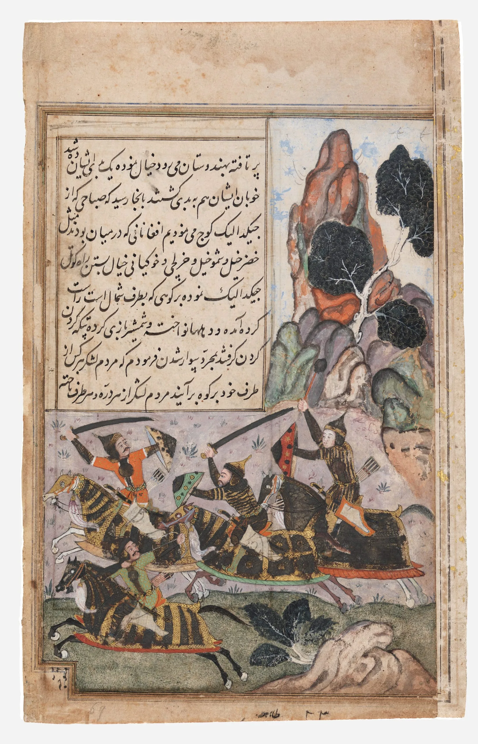 This folio is the right half of a double-page illumination. The facing composition on the left-hand page cannot now be traced. The episode illustrated occurred at the start of Babur’s second Hindustan campaign in September-October 1507. As Babur and his army marched out of Kabul, Afghanistan, they were blocked in the Jagdalak Pass by miscreant Afghans intending to rob them. Babur ordered his men to mount their horses and gallop towards them from all sides. The intimidated Afghans took flight and Babur went up the mountain in pursuit. He shot one of them in the arm and was captured. Several captured Afghans were impaled to set an example. The painting depicts a mountainous landscape with two of Babur’s mounted warriors attacking two fleeing Afghans on horseback. The Afghan in the foreground turns around on his horse and fires an arrow back at his attackers in the classic Parthian shot. His cohort above him also turns around to do battle with his sword and shield.