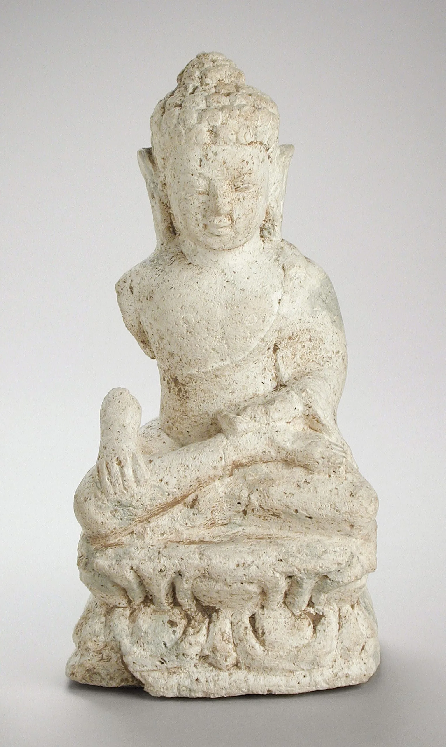 This Eastern Javanese volcanic tuff sculpture of a Buddha probably represents the historical Buddha Shakyamuni (traditionally dated to 563–483 BCE), although it is alternatively possible that it portrays the transcendental Jina Buddha Akshobhya (Unshakable One). Akshobhya, who presides over the Abhirati eastern heaven and whose symbolic color is blue, is one of the five Jina (Victor) Buddhas demonstrating the state and qualities of Buddhahood. In addition to Akshobya, they are Vairochana, Ratnasambhava, Amitabha, and Amoghasiddhi.
