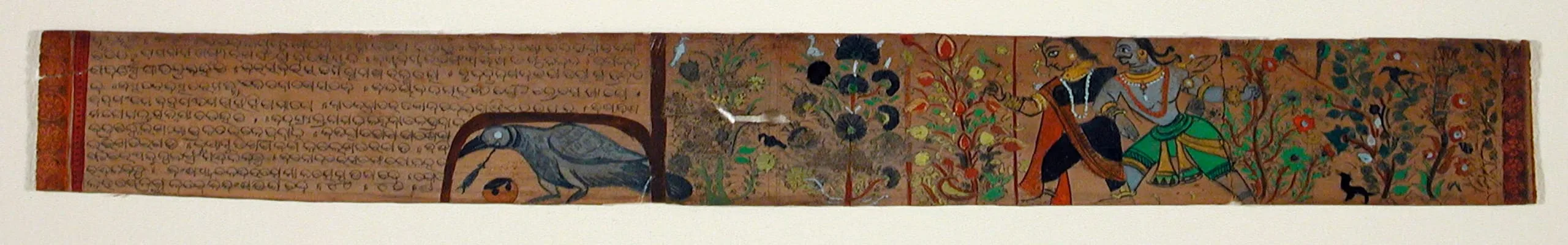 Recto: Rama and Sita watch a crow that he had just shot with an arrow because it was bothering Sita. The blue-skinned Rama holds a bow and gazes at the wounded crow shown in a cartouche at the left. Sita gestures towards the crow. The setting is a lush forest with flowering plants. Large panel of inscribed text. Red floral borders (slight variations).