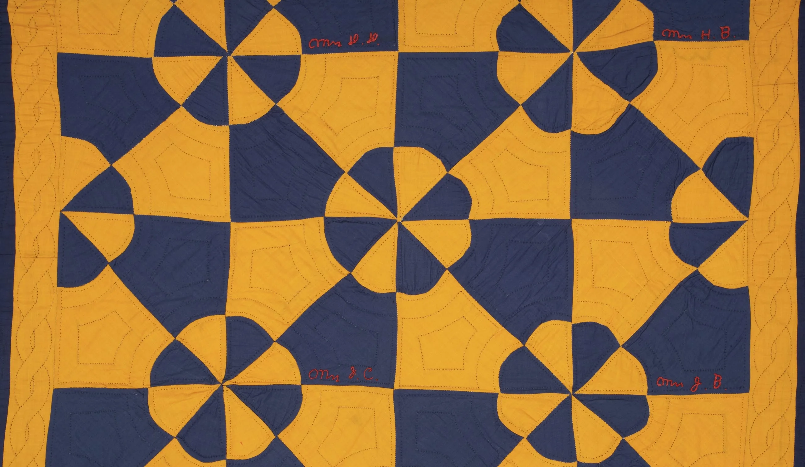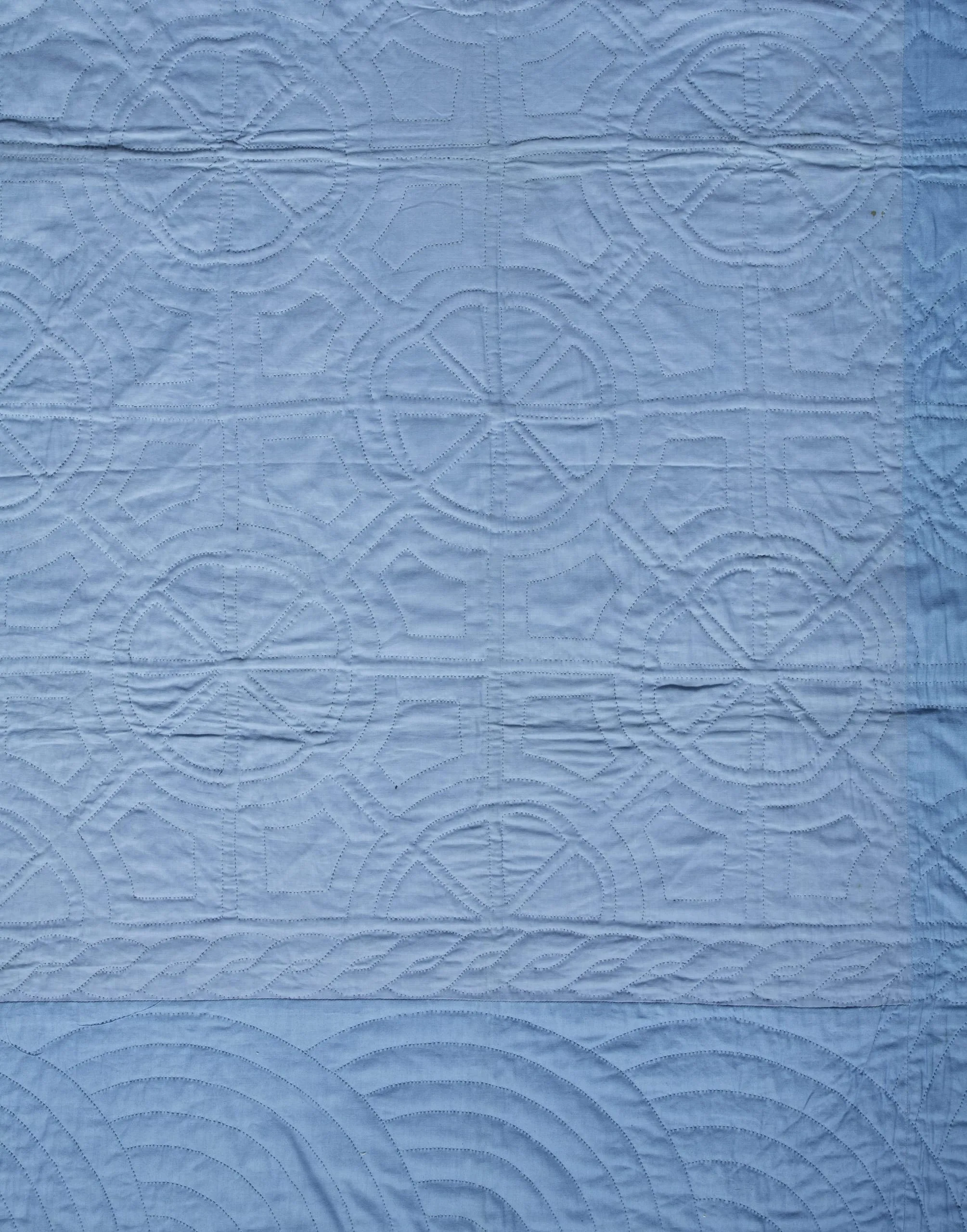 - Cotton plain weave, hand and machine pieced, hand embroidered and quilted