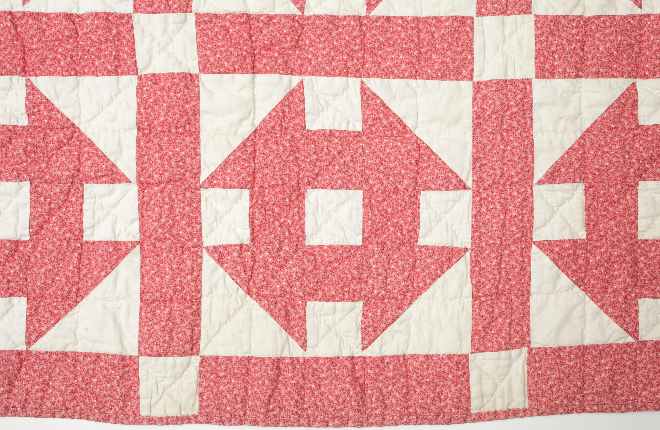 - Cotton plain weave, printed, hand and machine pieced, and quilted