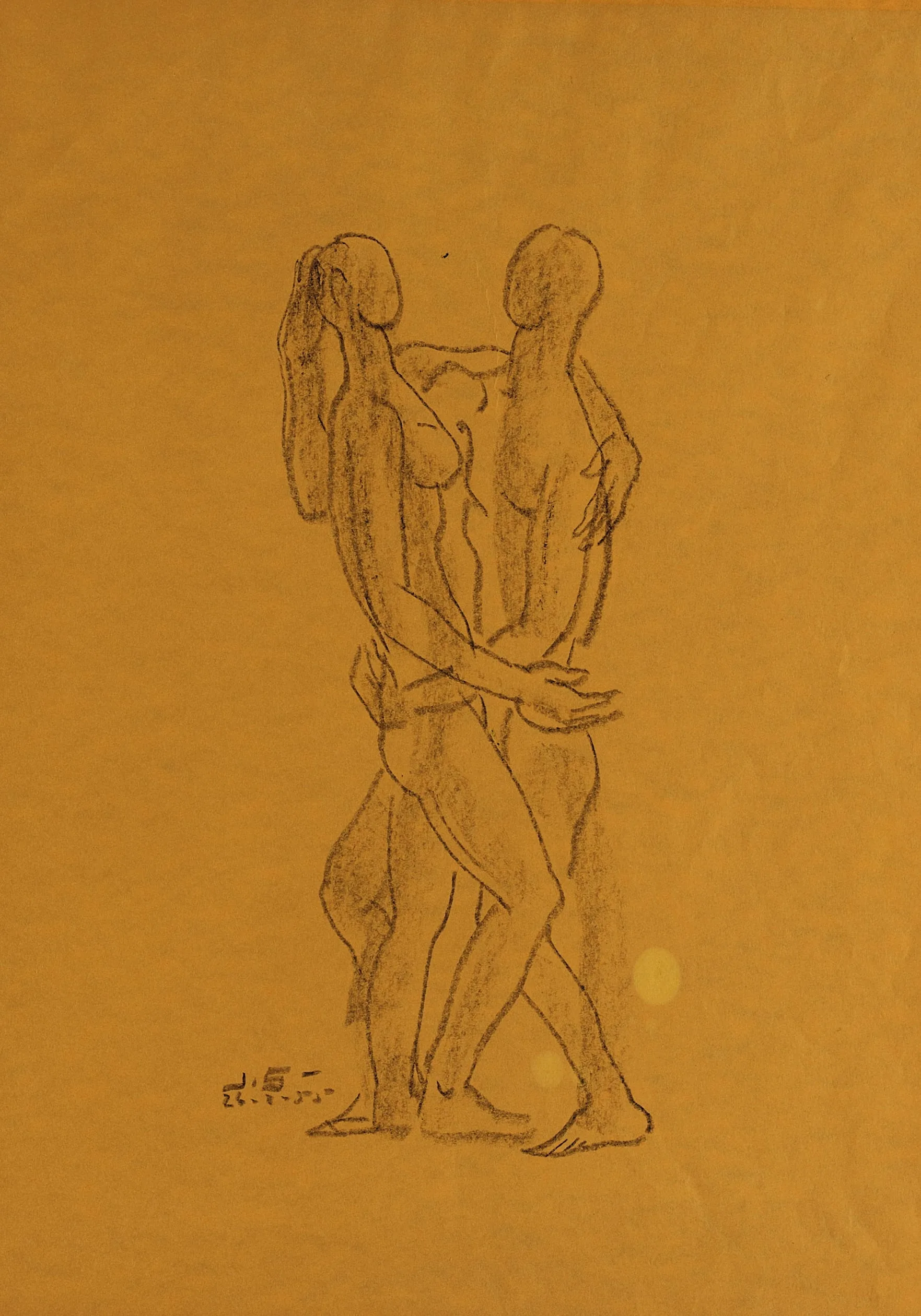 Charcoal drawing of two intertwined nude figures on amber-orange paper, rendered with loose gestural strokes and soft smudging