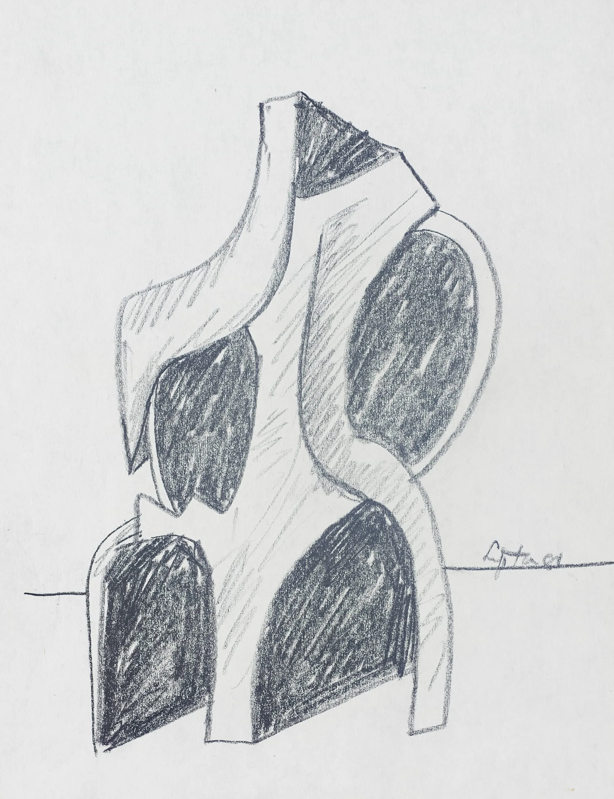 Graphite drawing on off-white paper, abstract upright form with rounded lobes, voids, and diagonal hatching suggesting a sculptural figure