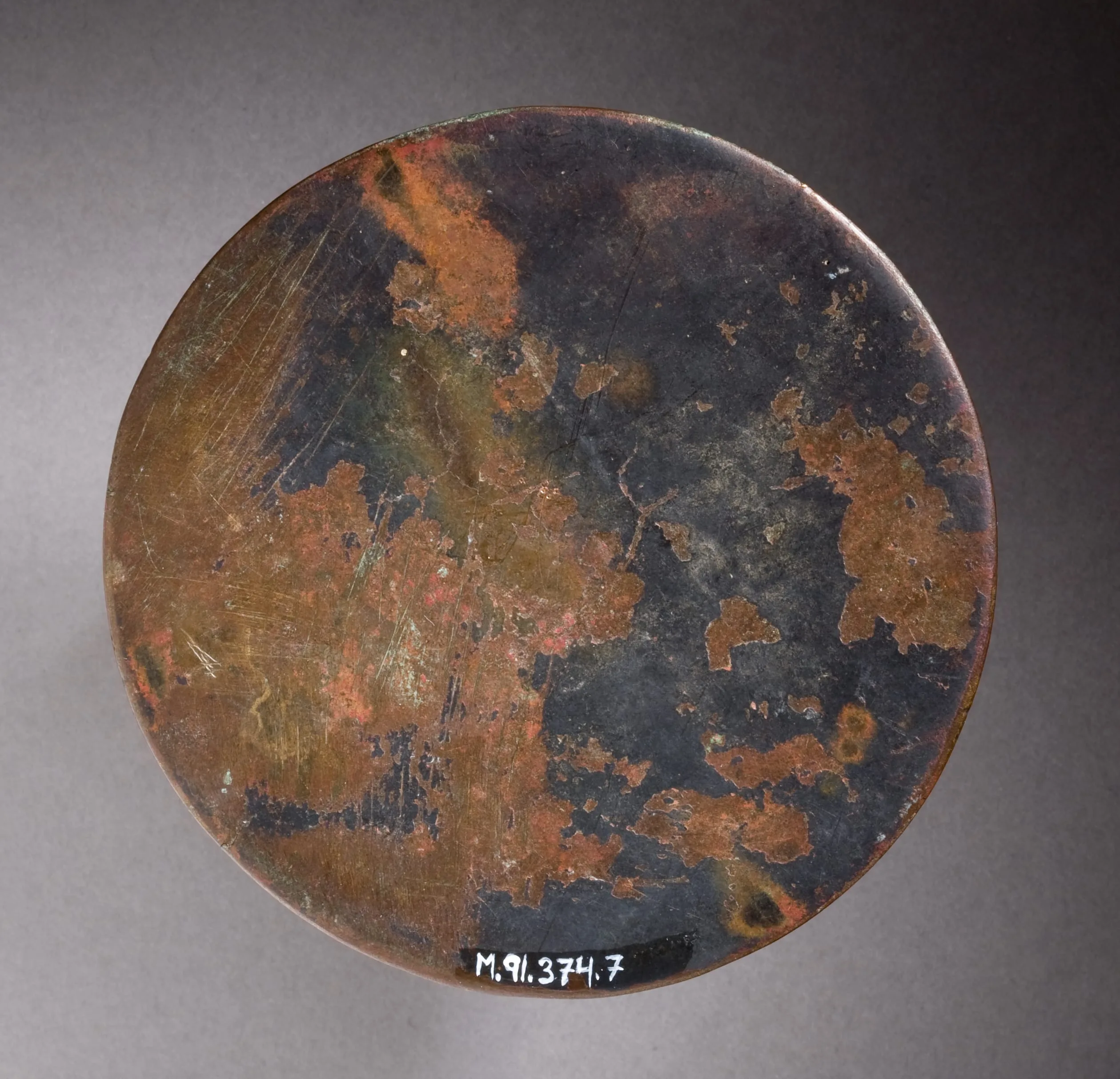 Circular bronze or copper disc viewed from above, heavily patinated surface with dark gray and rust-brown areas, fine scratches, and a small white accession label at the bottom