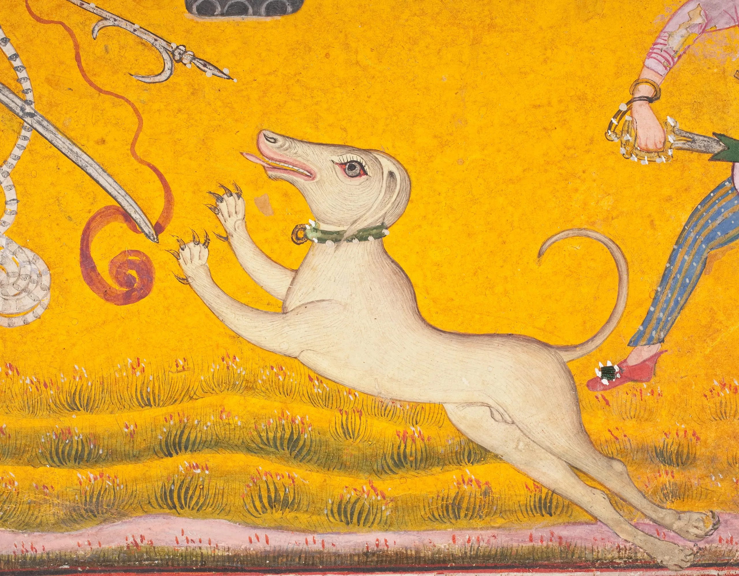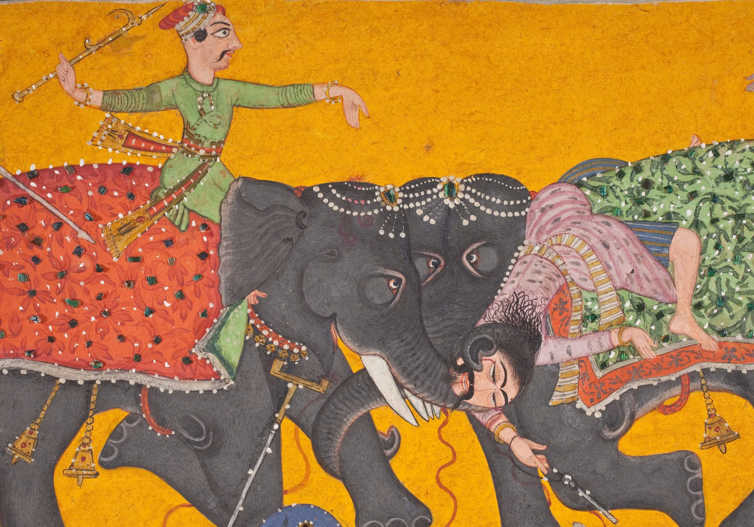 Here, two elephants are engaged in a fierce combat that has intensified dangerously out of control. While one of the elephants has wrapped his trunk wrapped around his opponent’s front leg, the second strangles his opponent’s mahout. Blood streams from their wounds. Even the hapless mahout’s elephant goad has been shattered by the ferocity of the attack. Various warriors and attendants, responsible for managing the animals with fireworks and Saluki dogs, unsuccessfully try to regain control of the situation.