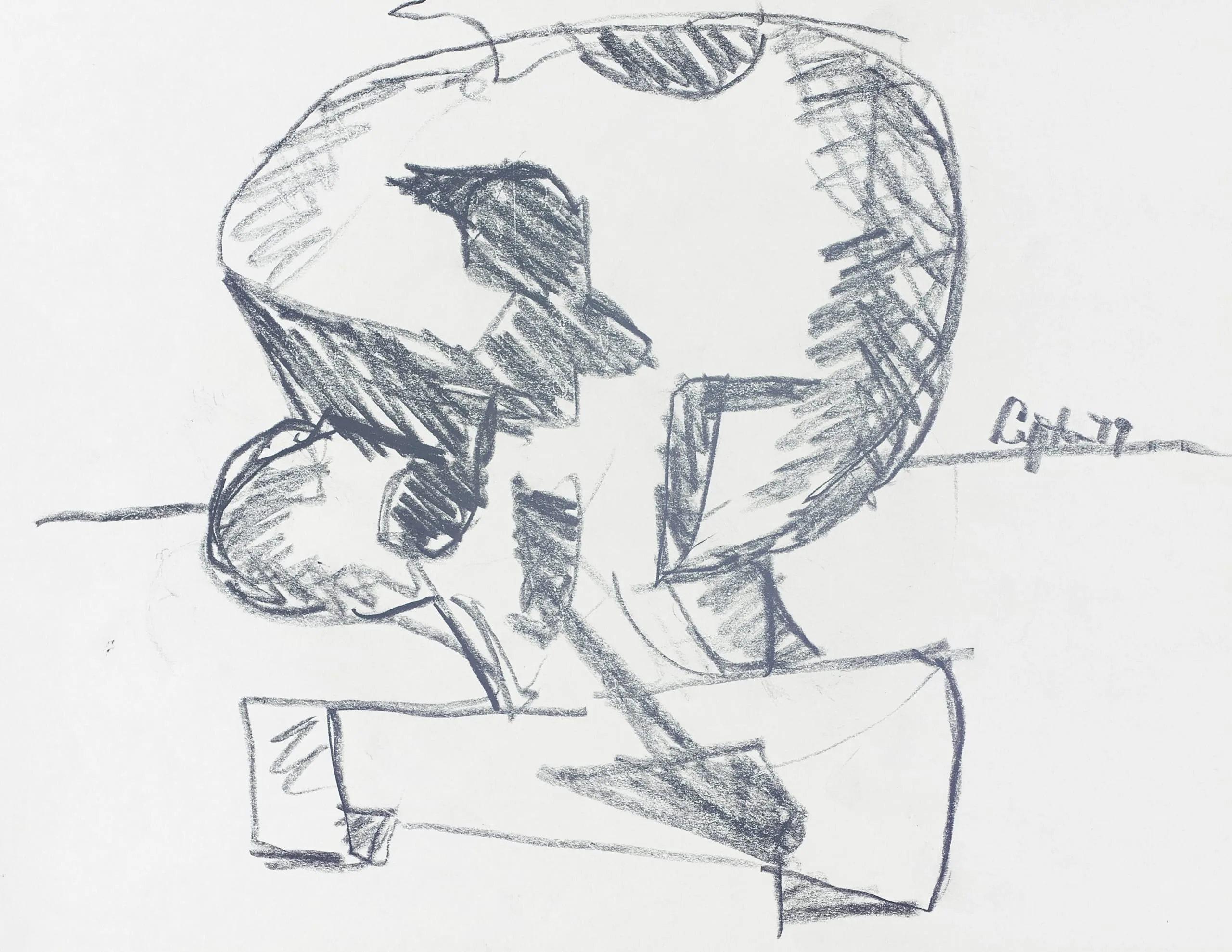 Gestural pencil drawing of a human skull on white paper, with loose crosshatching and sketchy blue-gray lines