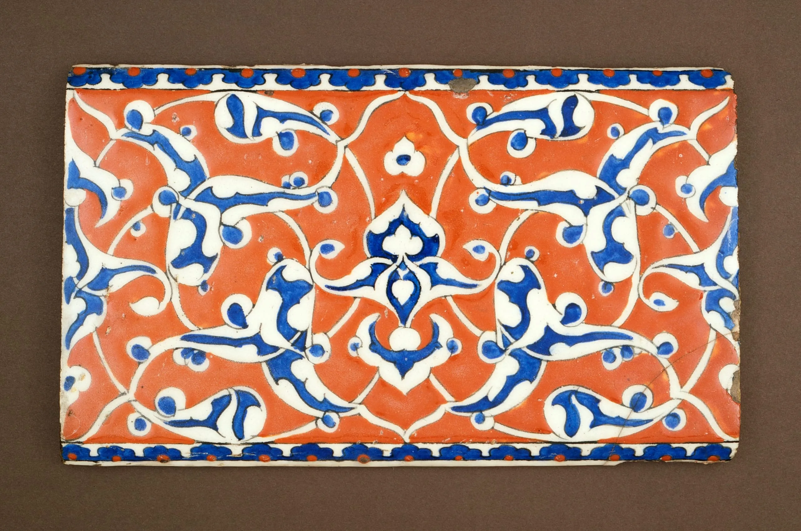 Tiles of this general type were popular in the second half of the sixteenth century, serving as borders for other multi-tile panels that graced the mosques and palaces of Istanbul. Tiles of this same design were used in the royal living quarters of Murad III at the Topkapi Saray Palace, as well as in its large domed antechamber dating to 1578. Such tiles are today widely dispersed, perhaps as a consequence of a devastating fire in the Harem in 1665, and can be found in museum collections the world over. (See https://collections.lacma.org/node/198922>M.2000.31 for another but different tile from this same section of the palace).