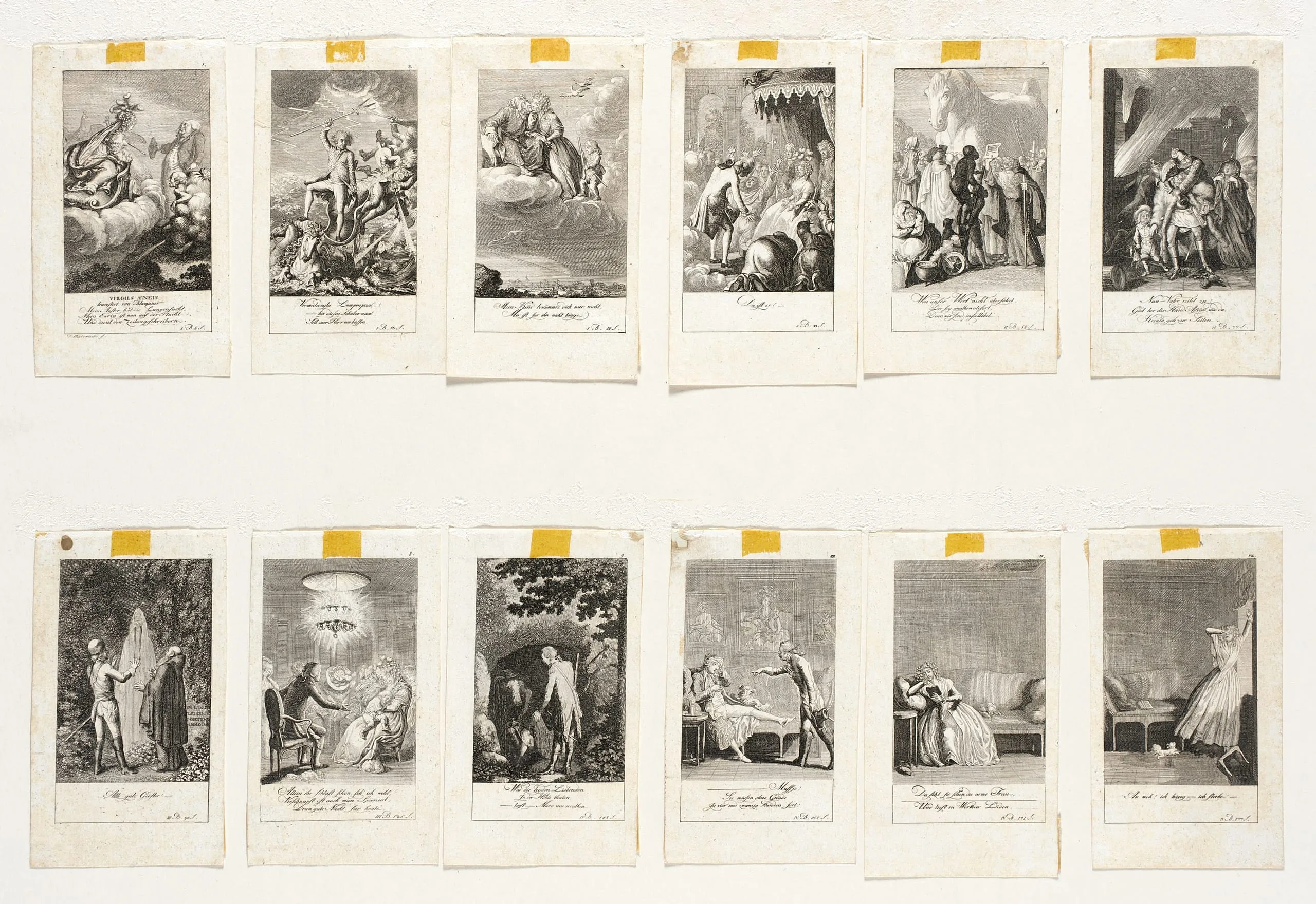 Set of twelve small vertical engravings on cream paper arranged in two rows of six, each depicting multi-figure narrative scenes with German text captions below