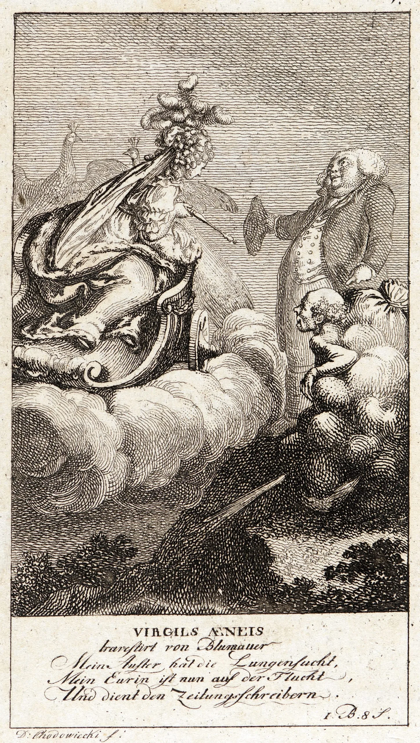 Engraving with fine crosshatching; two figures amid swirling clouds, one elaborately dressed with an ornate headdress, the other in 18th-century coat and powdered wig; a small crouching figure at lower right; German text and caption below reading "VIRGILS AENEIS"