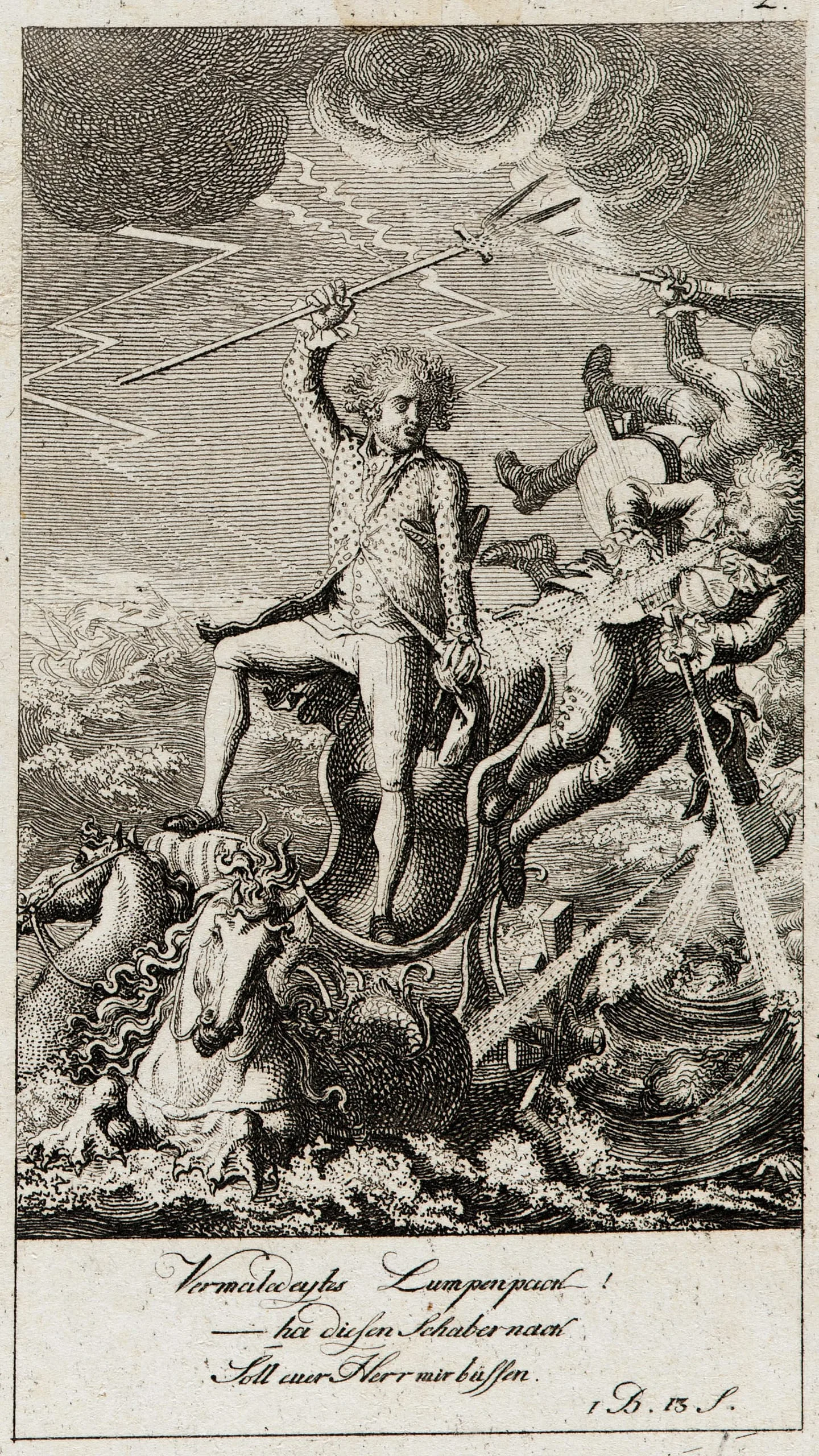 Engraving of a figure standing atop rearing sea-horses amid turbulent waves, arm raised holding a staff with lightning bolts in a stormy sky; a second figure tumbles behind. German script caption below.