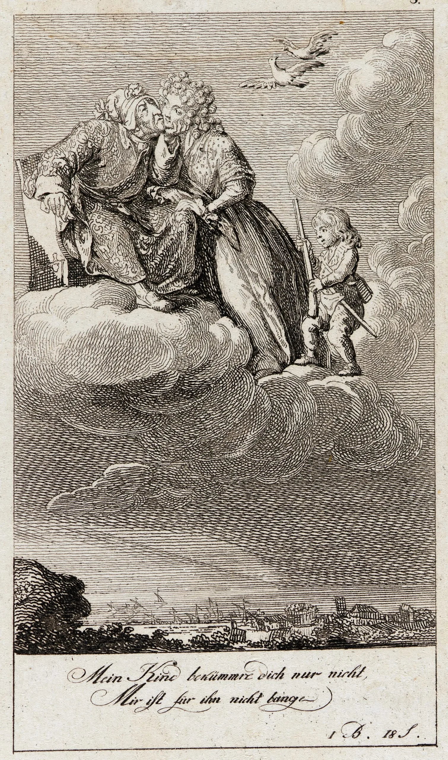 Engraving of two figures in 18th-century dress seated on clouds, leaning toward each other; a small armed child stands nearby on the clouds. A bird flies above, and a town landscape appears below. German script caption at bottom.