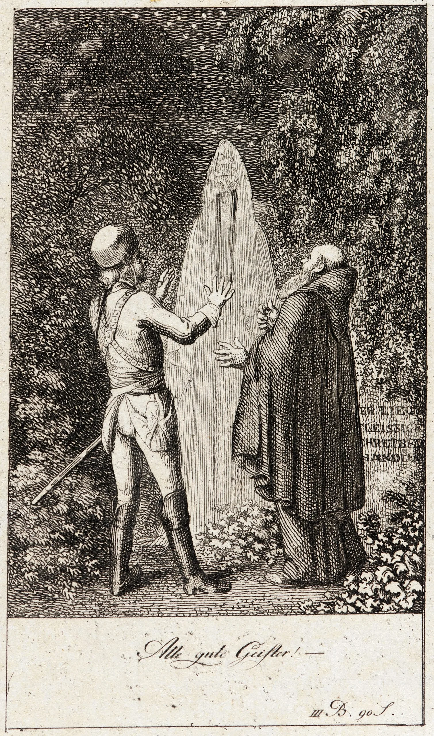 Engraving of two figures facing a shrouded apparition in a wooded setting; a young man in boots and a cap gestures toward the draped white form while an elderly bearded figure in a long cloak looks on; a gravestone is visible at right; German script caption reads "Alle gute Geister!" below.