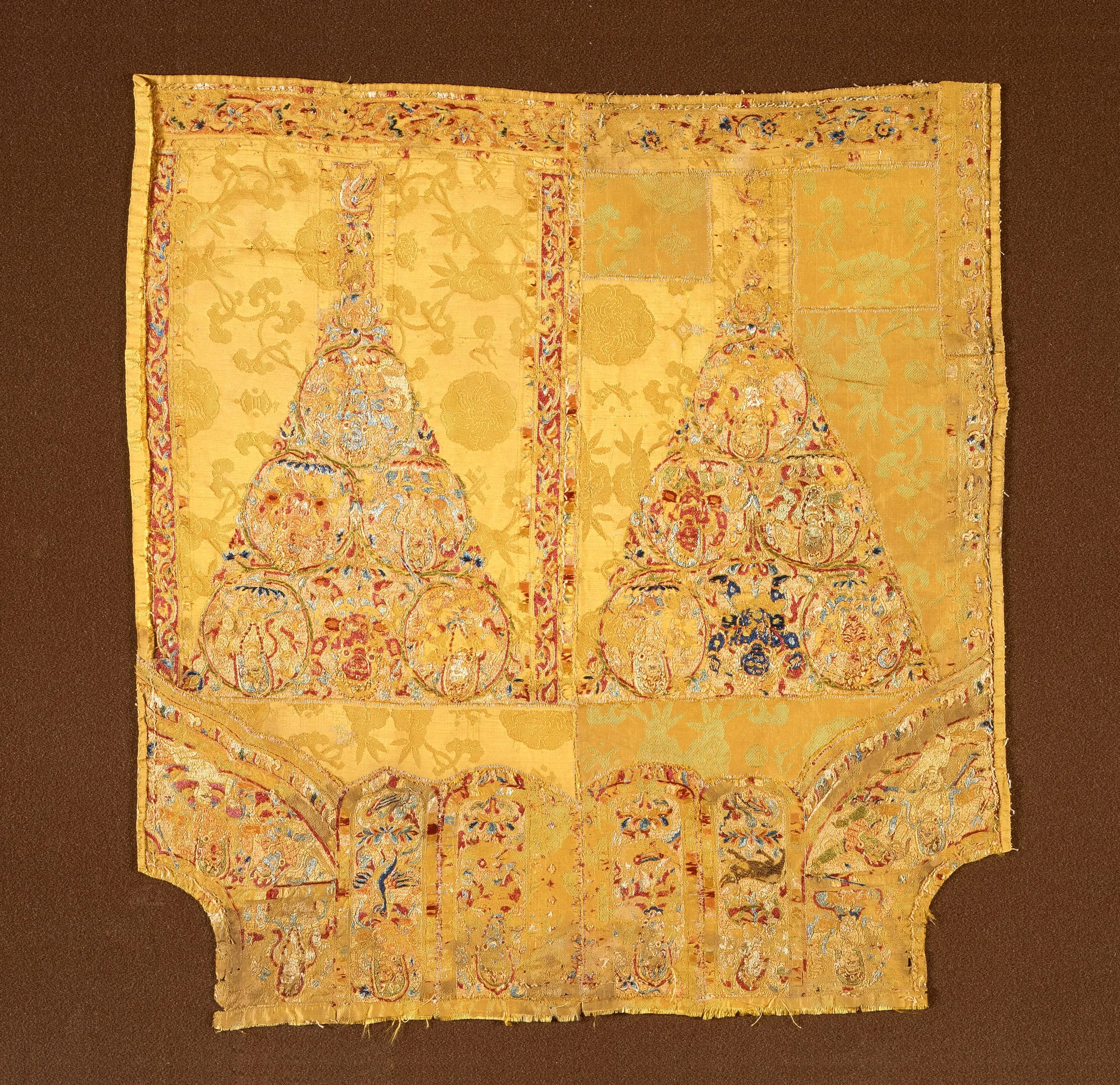 - Multicolor silk embroidery in brick and chain stitch on yellow silk damask