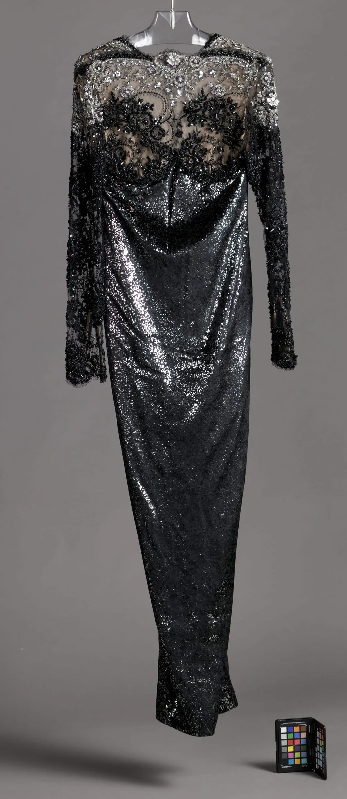 - Acetate/ polyamide velvet (panné), printed with cotton/ nylon lace, glass beads, plastic beads, and crystals