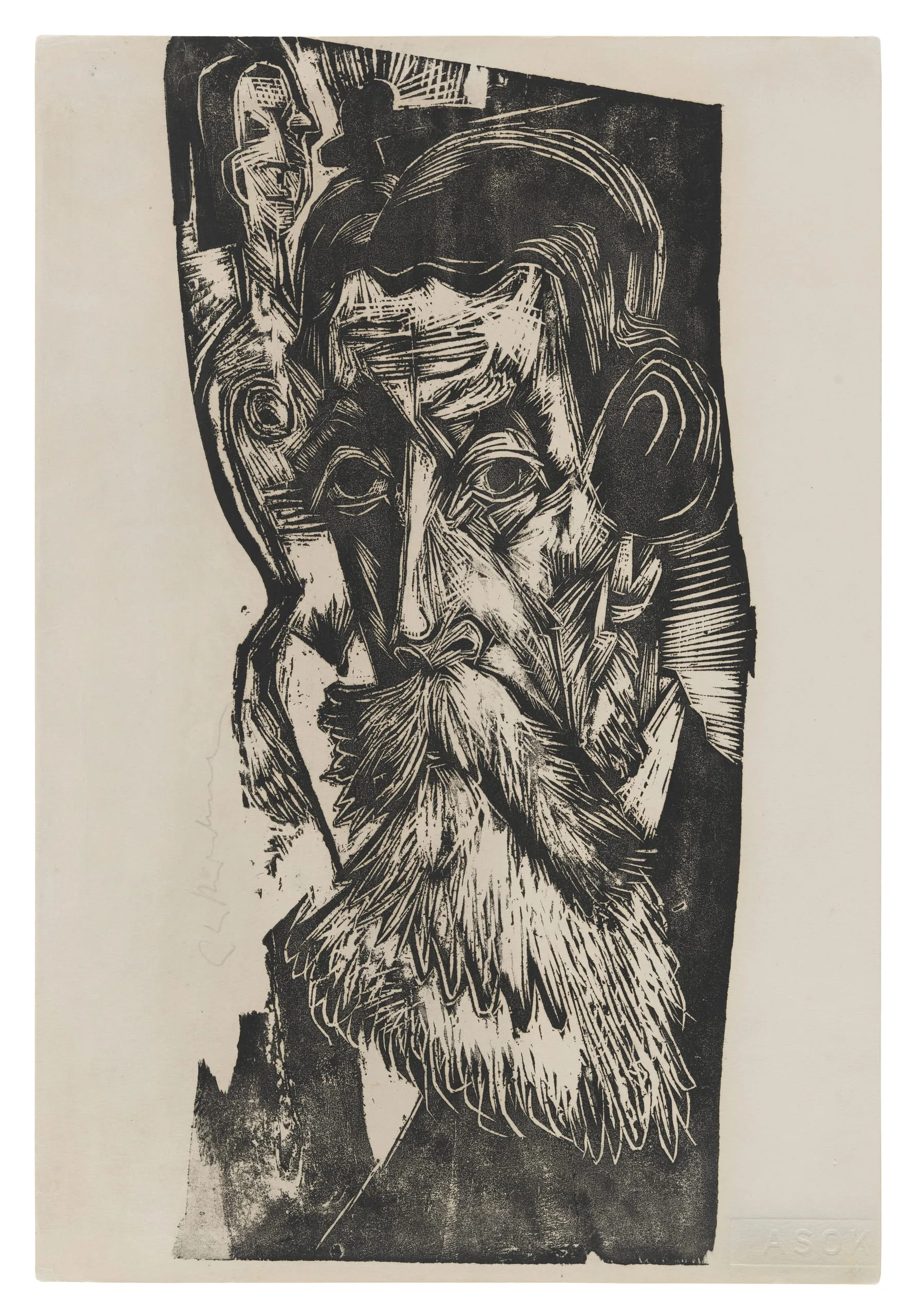 Ludwig Schames was a beloved modern art dealer from Frankfurt. After his death, Ernst Ludwig Kirchner reproduced this portrait in the periodical Querschnitt and wrote, “This was the art dealer Ludwig Schames...In him we lost a man who was unique like a good father, a friend...a sympathetic promoter of the art of our time.” Kirchner, who often carved his sculptures from a single piece of wood, here used an irregular plank for the print’s matrix, allowing its curved form to dictate the shape of the finished image.