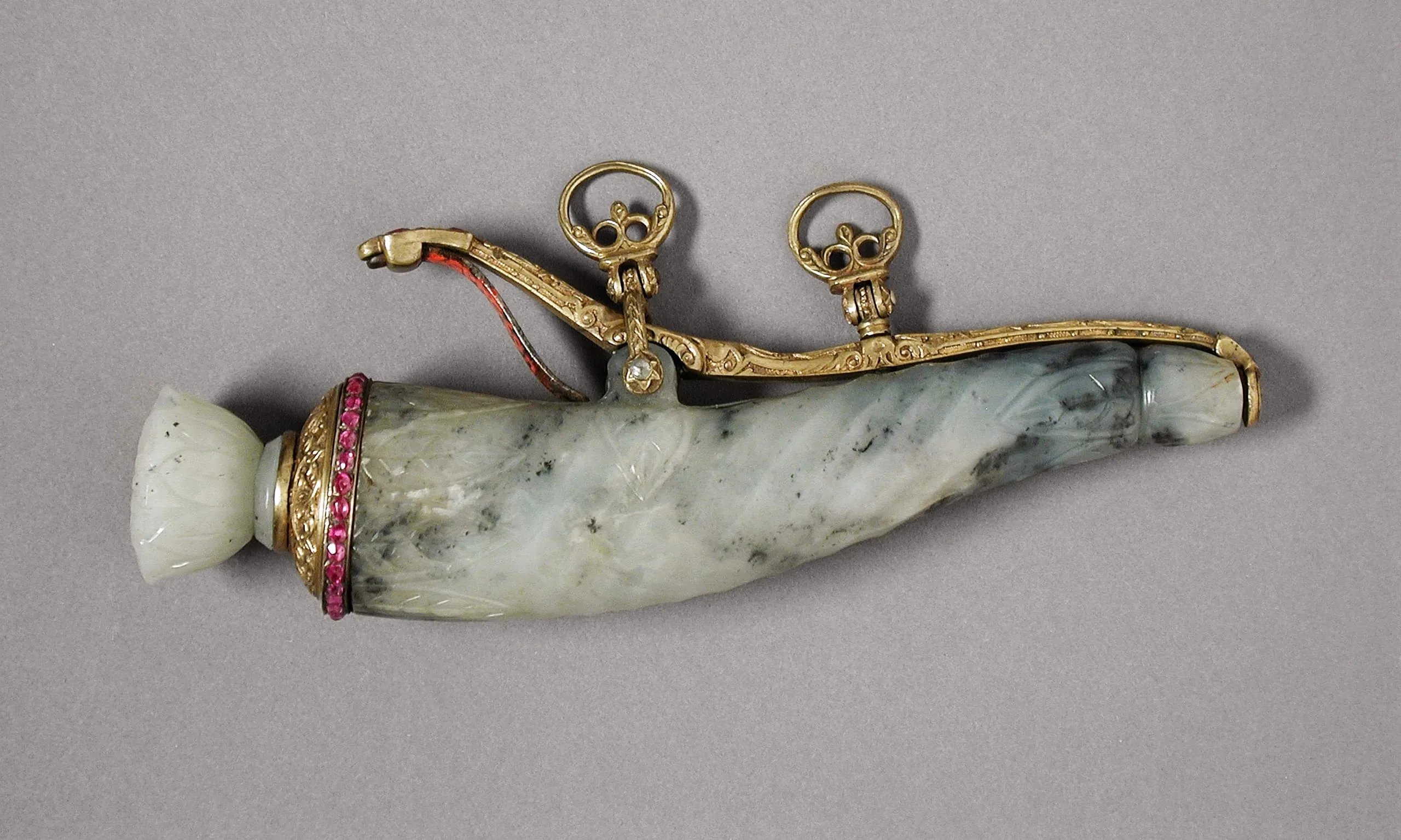 Powder primer flasks were used to prime the flashpan and touchhole of early muskets. The weapons were fired by igniting the priming powder, in turn detonating the charge powder, which was loaded from larger containers known as powder horns. South Asian primer flasks are made of a variety of materials, including ivory, jade, nautilus shells, and ibex horns. Numerous ivory primer flasks survive, but jade examples are considerably rarer. Ivory primer flasks fashioned in the shape of an antelope and decorated with lively hunting scenes are significant for being among the earliest Mughal decorative objects known to have reached Europe. Stylistic relationships with paintings and extant drawings of primer flasks suggest that pictorial artists may have participated in their design.